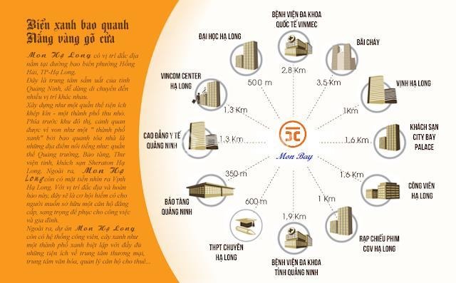 Vị trí của Mon Bay khiến cư dân dễ dàng tiếp cận mọi tiện ích của thành phố Hạ Long. Đại học Hạ Long chỉ cách 500m, Bảo tàng Quảng Ninh 350m, Vincom Center 1,3km. Rạp chiếu phim CGV, Cao đẳng Y tế, bệnh viện, ngân hàng – tất cả đều trong bán kính 1-2km.