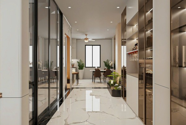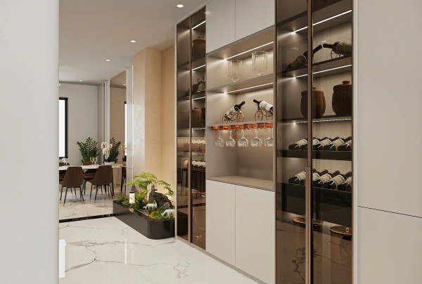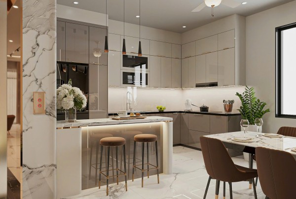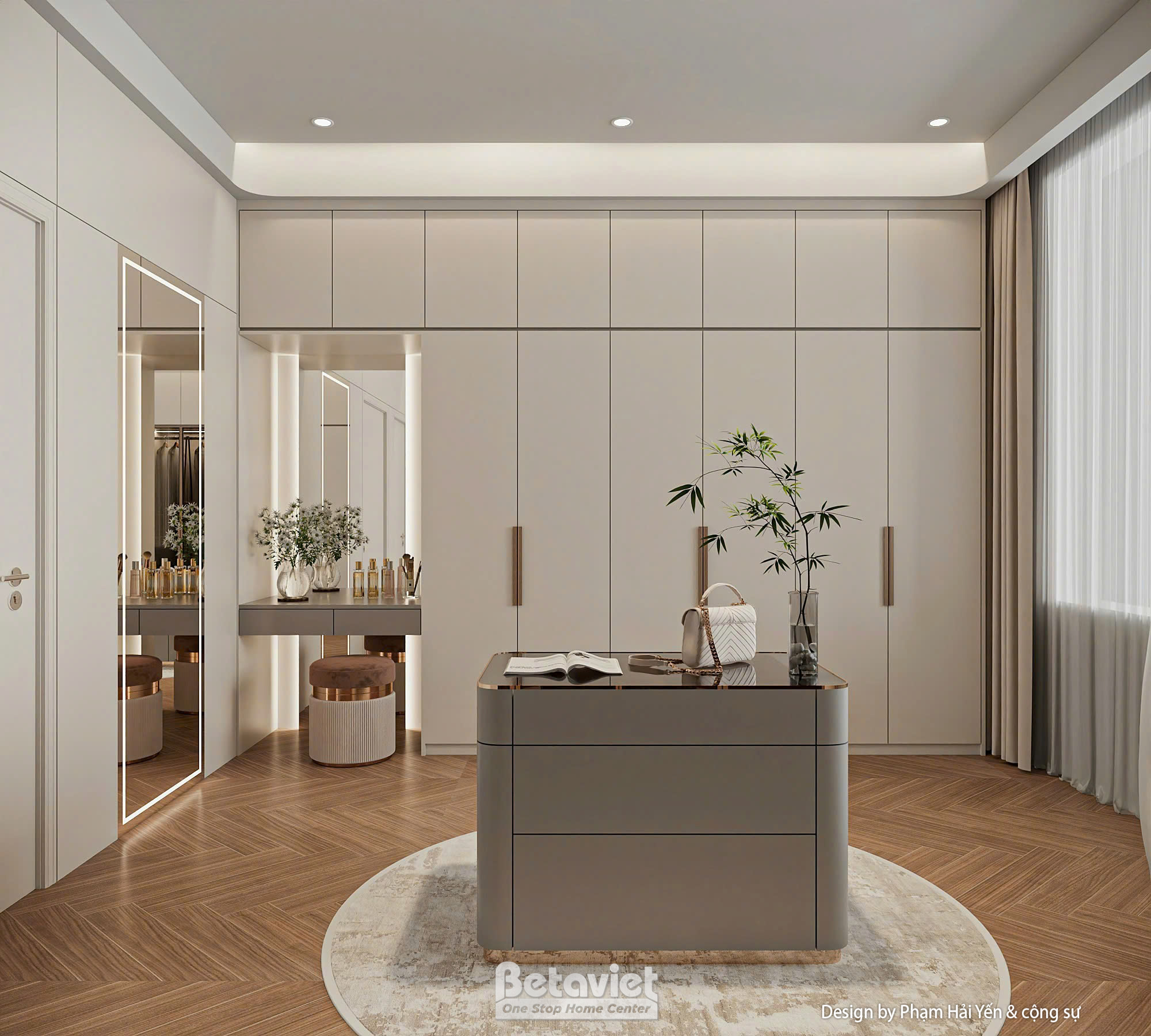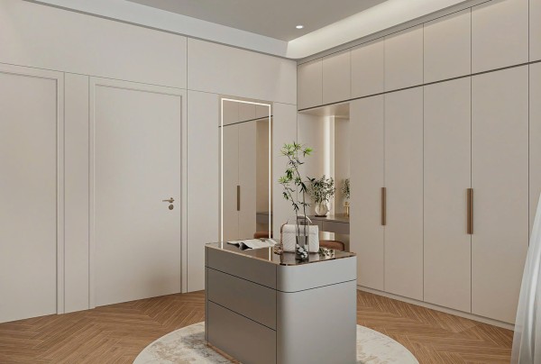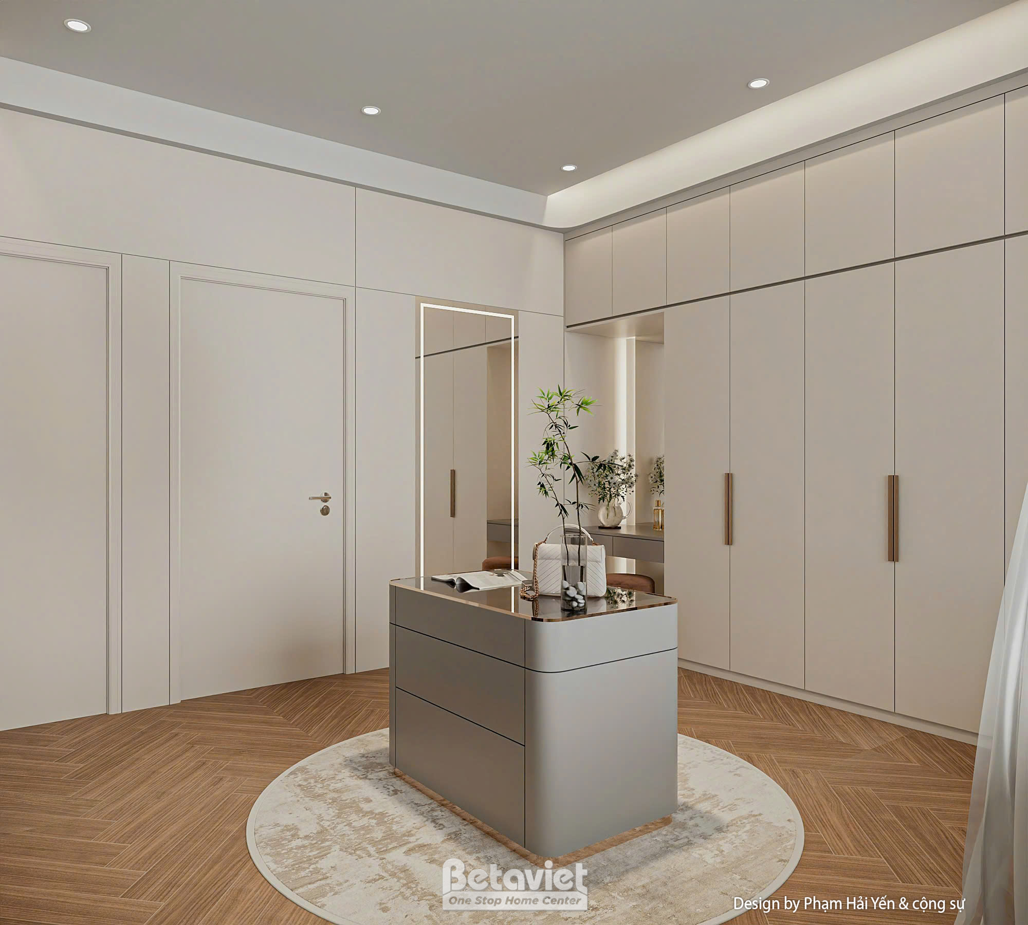 Đặc biệt, khu vực bàn trang điểm với gương lớn viền đèn LED, ghế tròn bọc nệm và mặt bàn ốp đá sang trọng, được bố trí gọn gàng cạnh góc tường – một chi tiết nhỏ nhưng thể hiện sự chỉn chu trong từng đường nét thiết kế, đáp ứng nhu cầu sống tiện nghi và đẳng cấp của gia chủ.