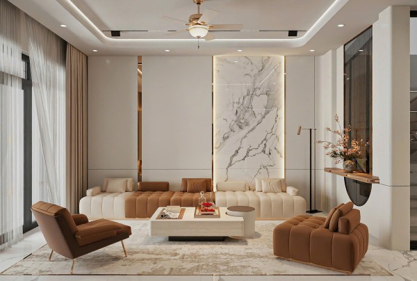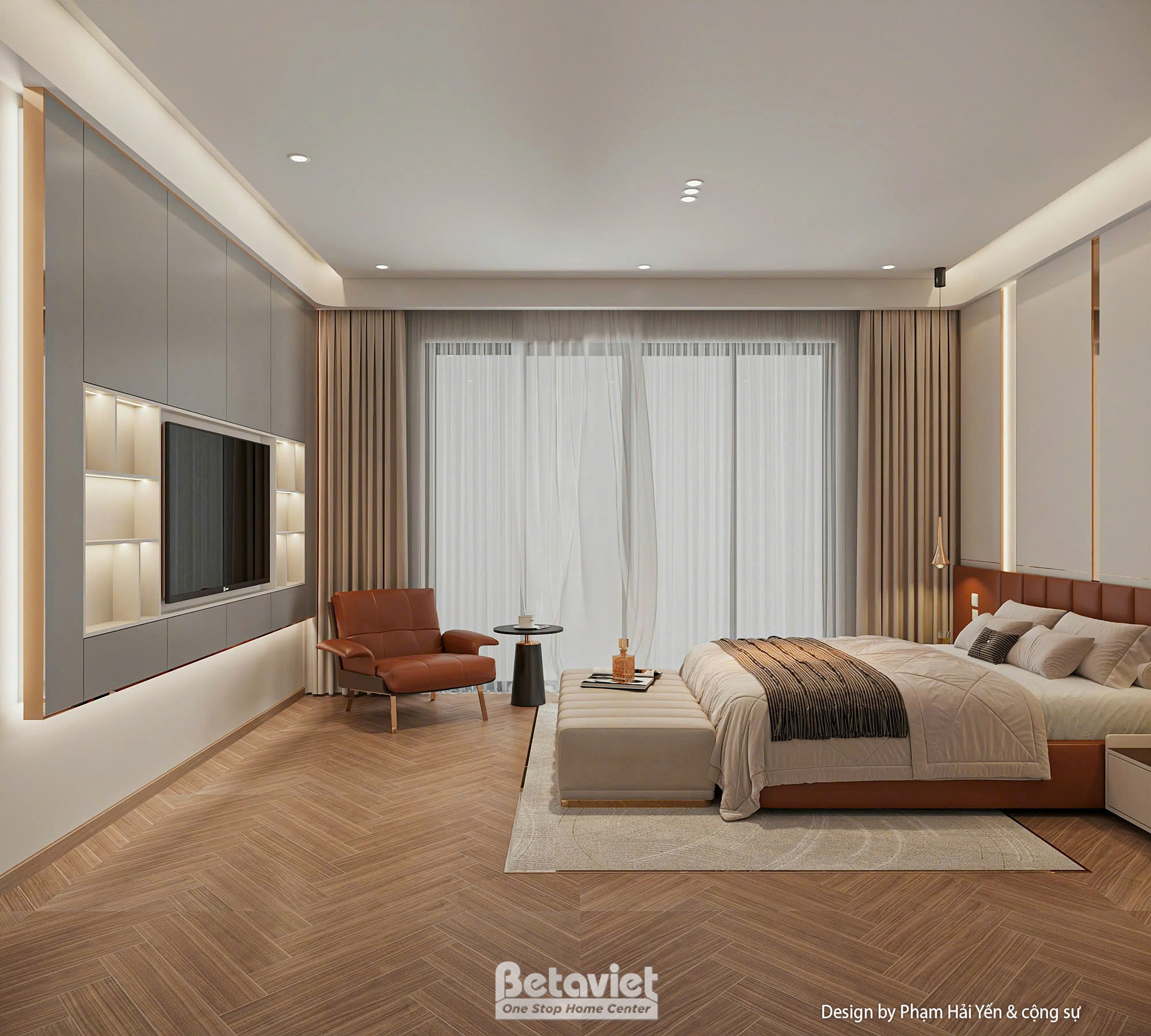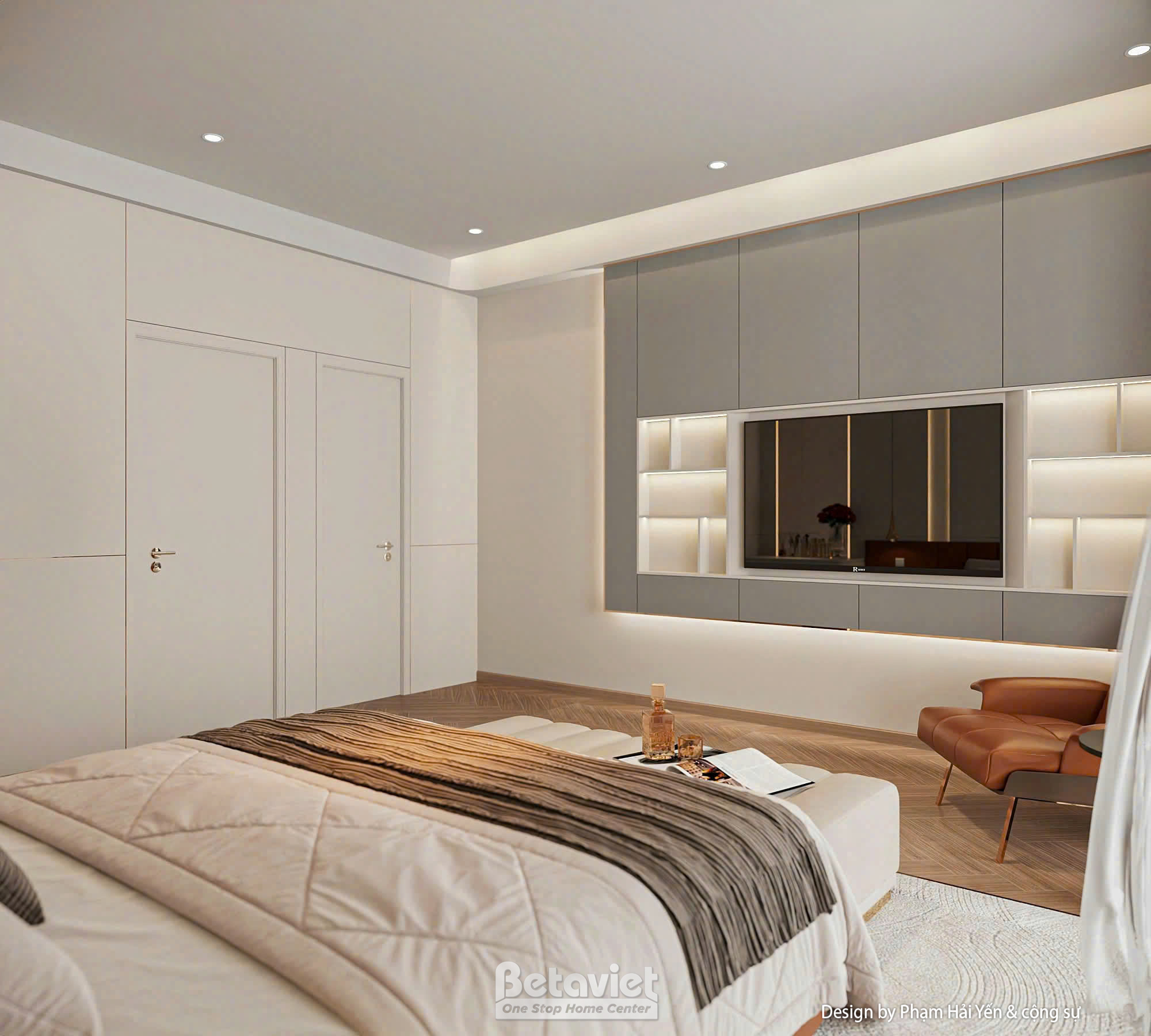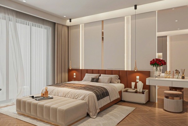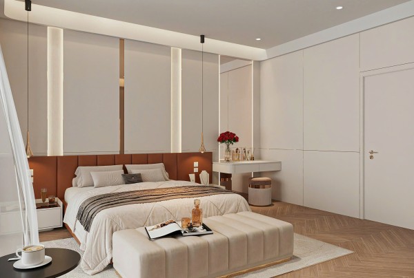 Toàn bộ không gian sử dụng bảng màu trung tính chủ đạo với các sắc độ nhẹ nhàng như trắng kem, be và nâu gỗ – tạo nên cảm giác ấm áp, thư giãn tuyệt đối. Giường ngủ được đặt ở vị trí trung tâm, nổi bật với phần đầu giường bọc da cao cấp màu nâu đồng sang trọng, kết hợp các mảng ốp tường lớn có ánh đèn hắt nhẹ, tạo nên hiệu ứng thị giác ấn tượng mà không gây rối mắt.