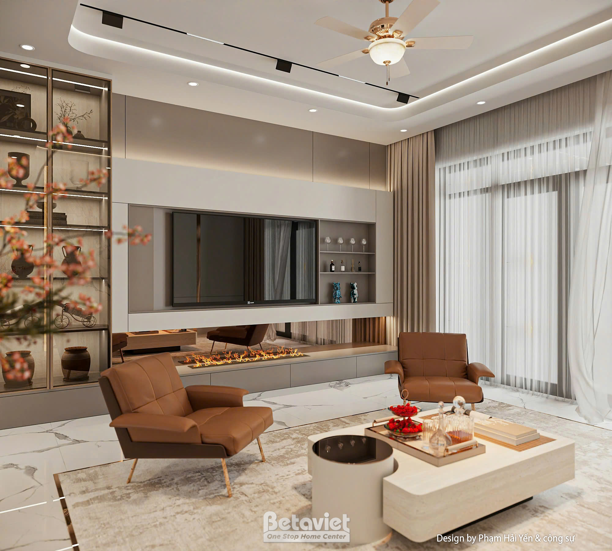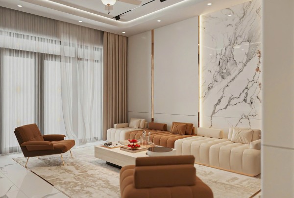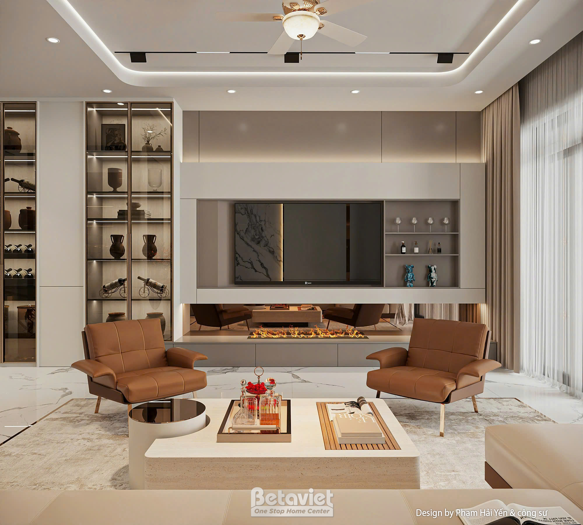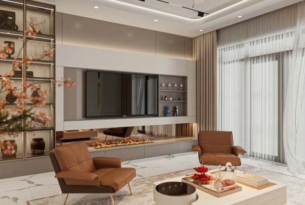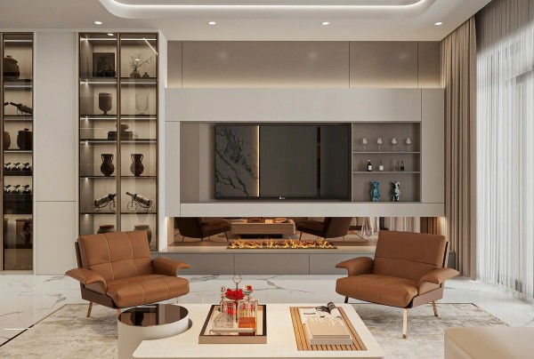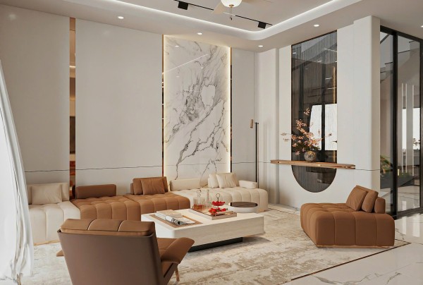 Toàn bộ không gian sử dụng bảng màu trung tính chủ đạo với các sắc độ nhẹ nhàng như trắng kem, be và nâu gỗ – tạo nên cảm giác ấm áp, thư giãn tuyệt đối. Giường ngủ được đặt ở vị trí trung tâm, nổi bật với phần đầu giường bọc da cao cấp màu nâu đồng sang trọng, kết hợp các mảng ốp tường lớn có ánh đèn hắt nhẹ, tạo nên hiệu ứng thị giác ấn tượng mà không gây rối mắt.