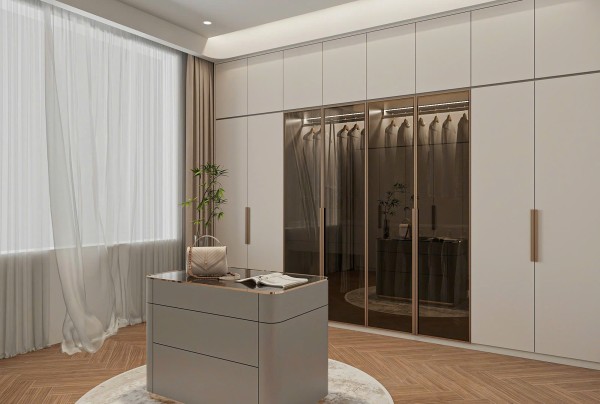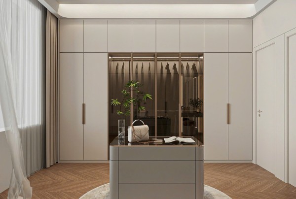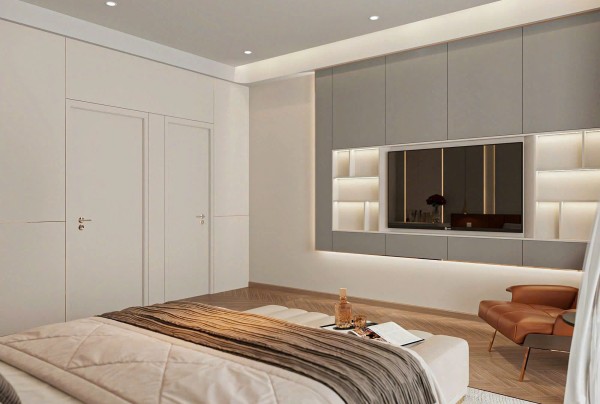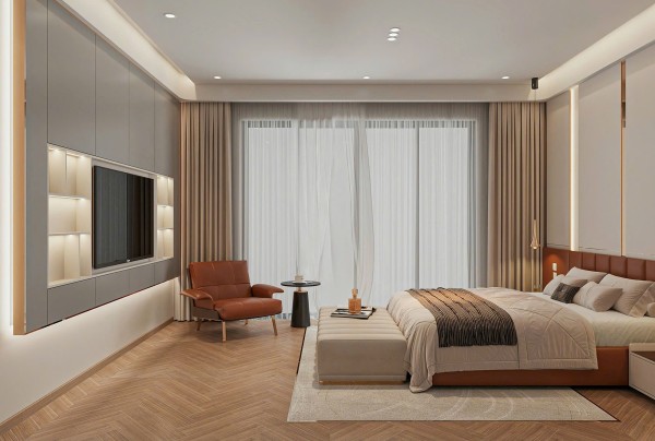 Hệ tủ tường thiết kế âm, phẳng, đồng bộ với tone màu tổng thể của căn phòng, mang lại sự liền mạch và gọn gàng – yếu tố then chốt trong các mẫu thiết kế nội thất phòng ngủ theo phong cách hiện đại. Không gian được mở rộng thị giác nhờ việc sử dụng gương lớn bố trí khéo léo, kết hợp cùng rèm vải hai lớp điều chỉnh ánh sáng tự nhiên hiệu quả.