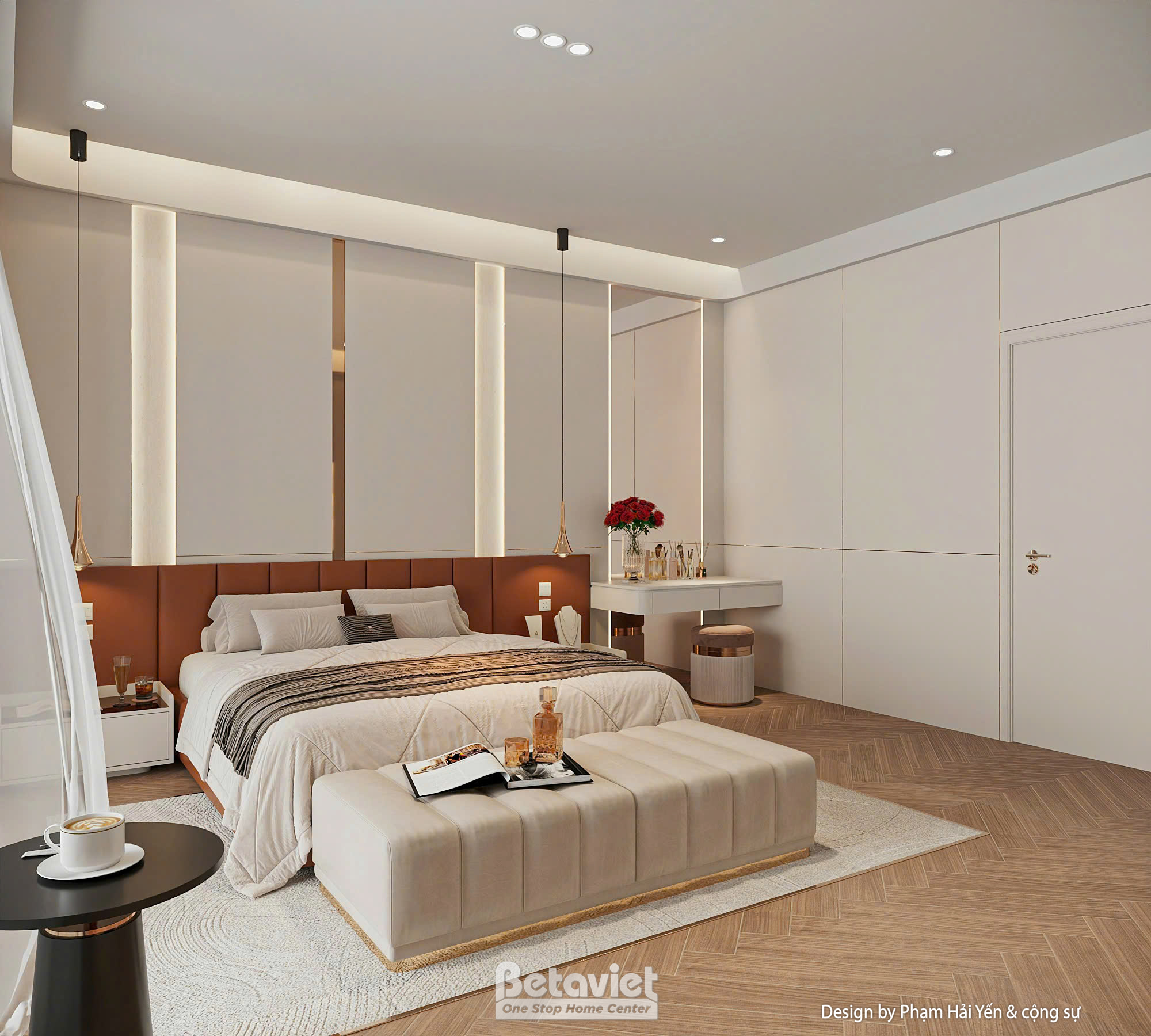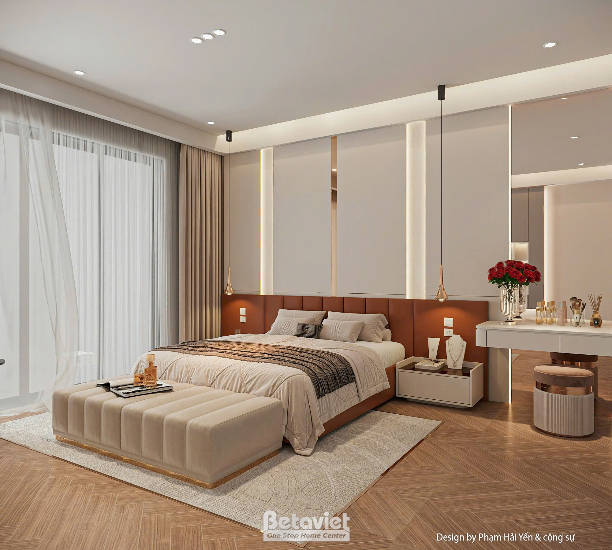 Hai bên giường là hệ tab đầu giường đơn giản nhưng hiện đại, đi kèm đèn thả trần tinh tế, giúp tăng chiều sâu cho không gian và tạo điểm nhấn đầy nghệ thuật. Bên dưới chân giường là băng ghế dài bọc nhung màu be sáng, vừa làm vật trang trí, vừa tăng thêm tiện ích khi sử dụng.
