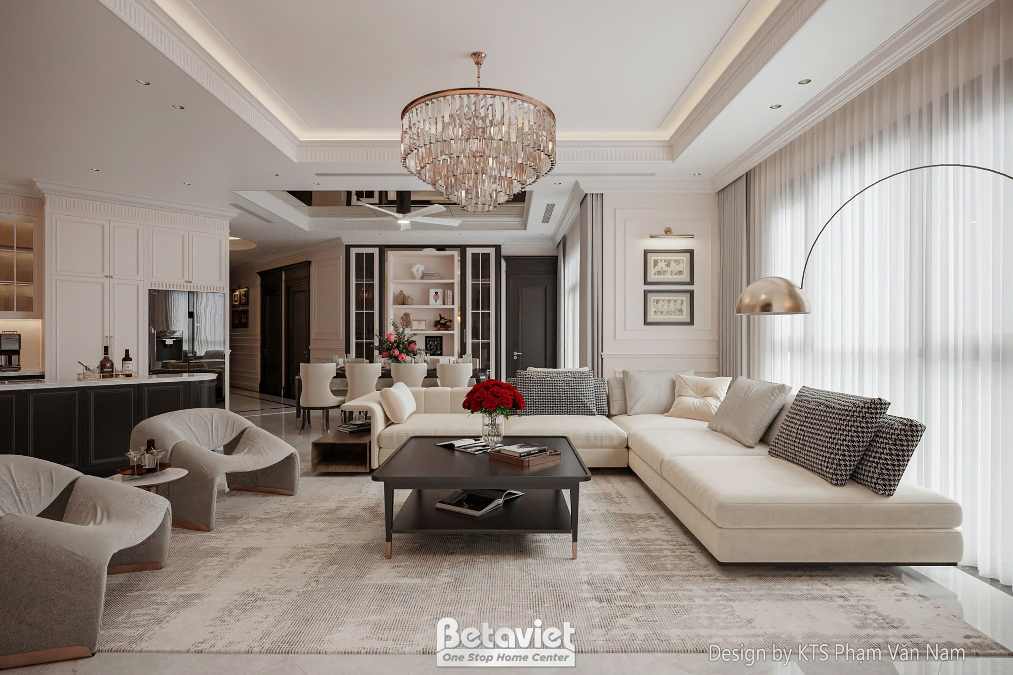 Không gian phòng khách được bài trí bởi bộ sofa bọc vải màu xám xanh, rèm cửa màu vàng nhạt và thảm trải sàn họa tiết cổ điển. Điểm nhấn của phòng khách chính là bức tranh sơn dầu cỡ lớn vẽ phong cảnh thiên nhiên. Khu vực bếp và phòng ăn được bố trí liền kề với tone màu trắng – nâu gỗ. Hệ tủ bếp sơn trắng cùng bàn đảo bếp bằng gỗ cao cấp và dãy đèn thả hiện đại tạo điểm nhấn cho không gian.