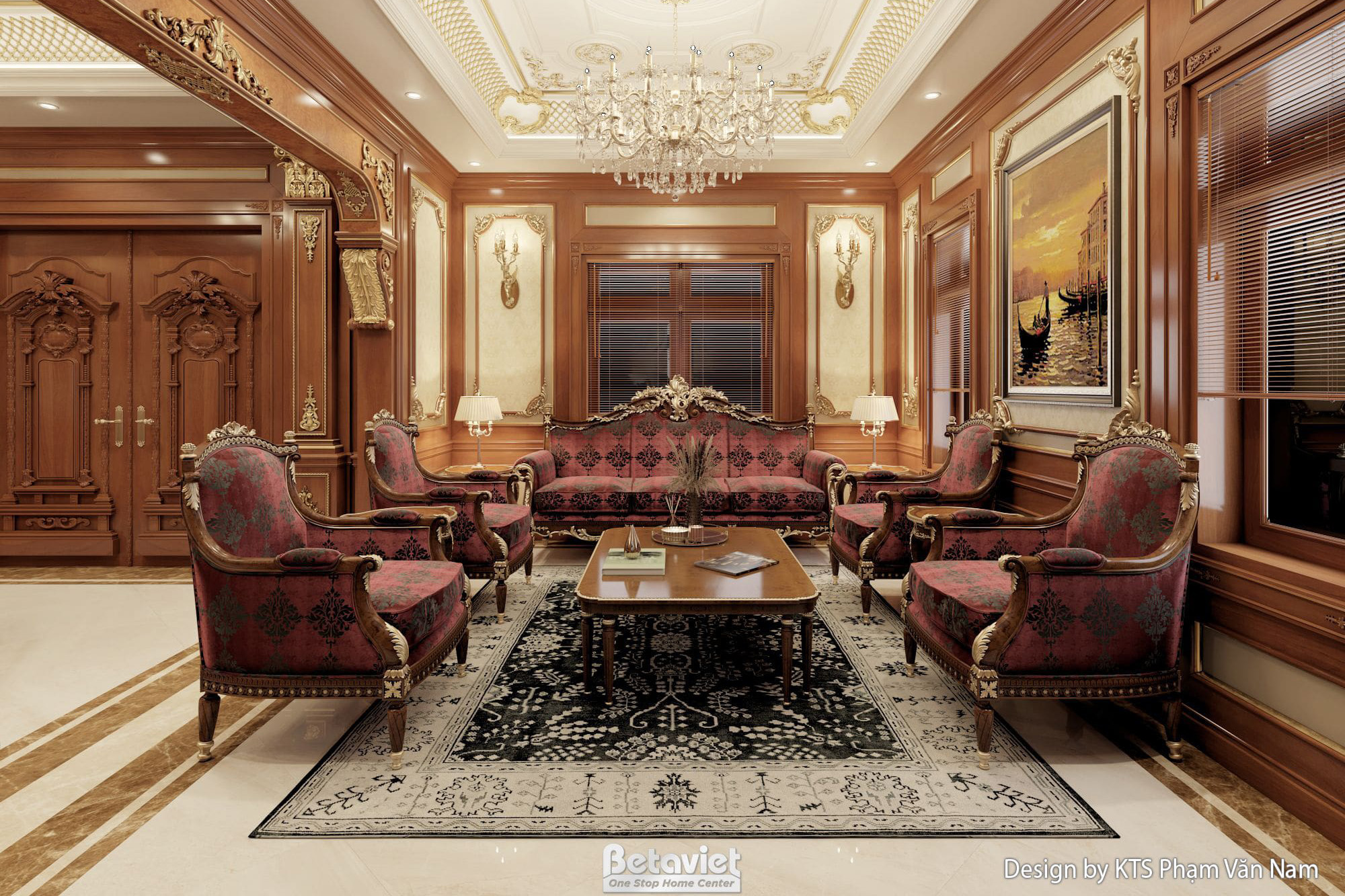 Sảnh chính và phòng khách được kết nối bởi hệ cửa gỗ cổ điển với họa tiết hoa văn uốn lượn. Gam màu chủ đạo của phòng khách là màu đỏ rượu và vàng hoàng gia, thể hiện qua bộ sofa bọc nhung cao cấp, thảm trải sàn tông đỏ và rèm cửa vàng kem. Phòng ăn ấn tượng với bàn ăn bầu dục cẩm thạch trắng, ghế ăn bọc nỉ màu đỏ đô và đèn chùm pha lê tinh xảo. Phòng ngủ chính nổi bật với giường và rèm cửa màu vàng hoàng gia, những bức tranh sơn dầu cổ điển và sàn gỗ trải thảm lông sang trọng.