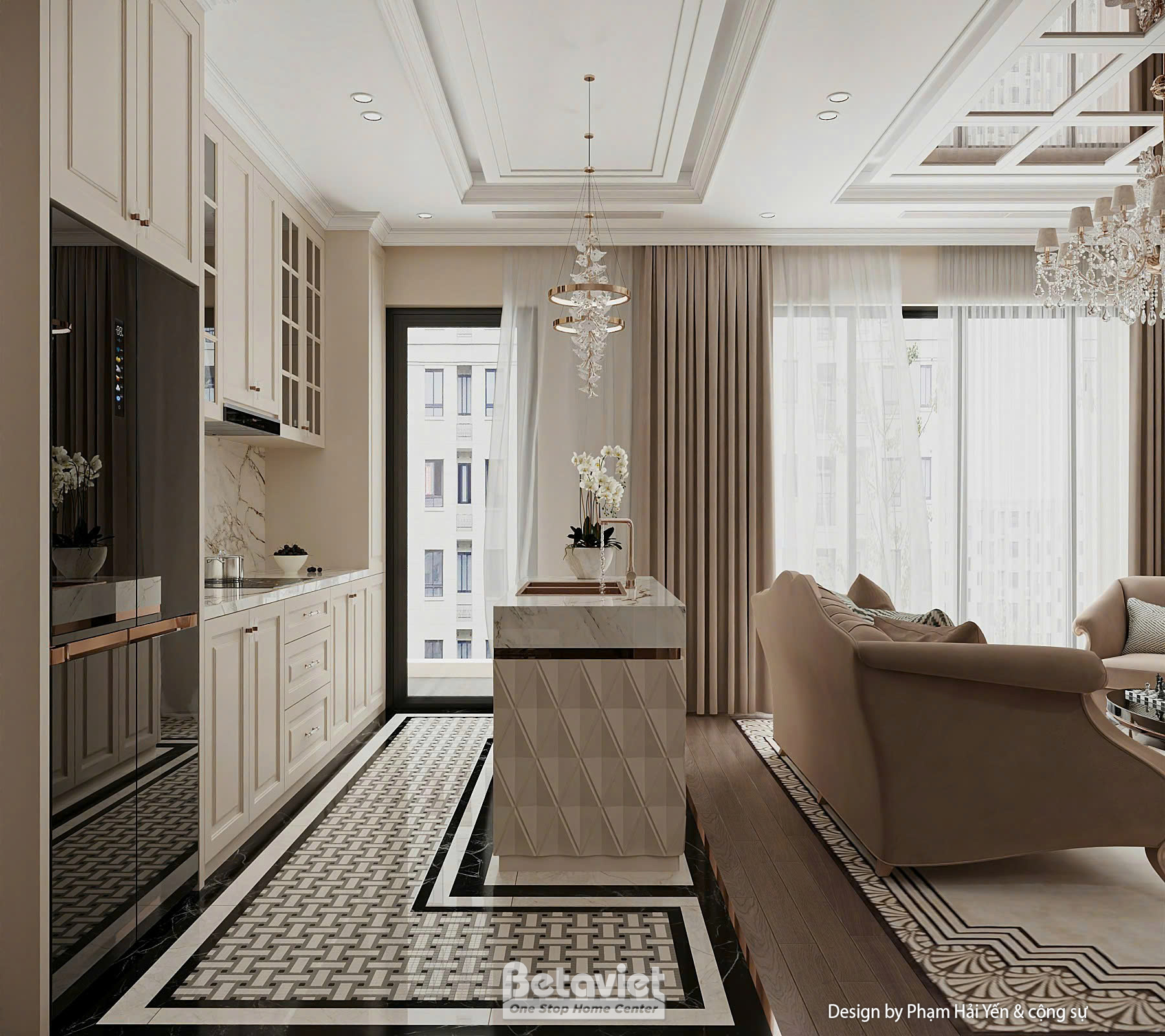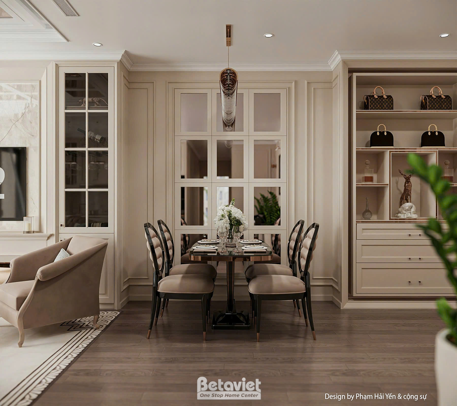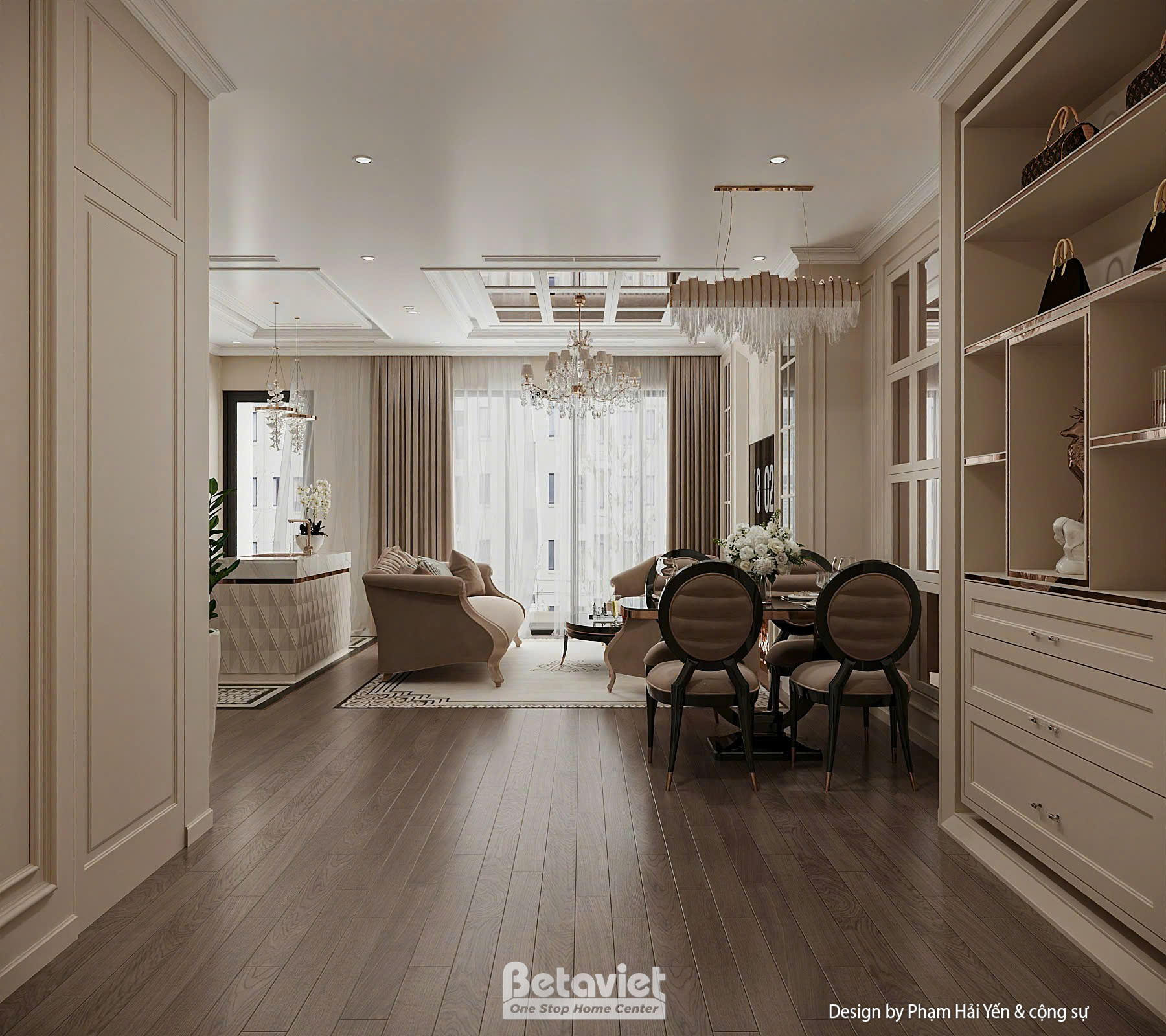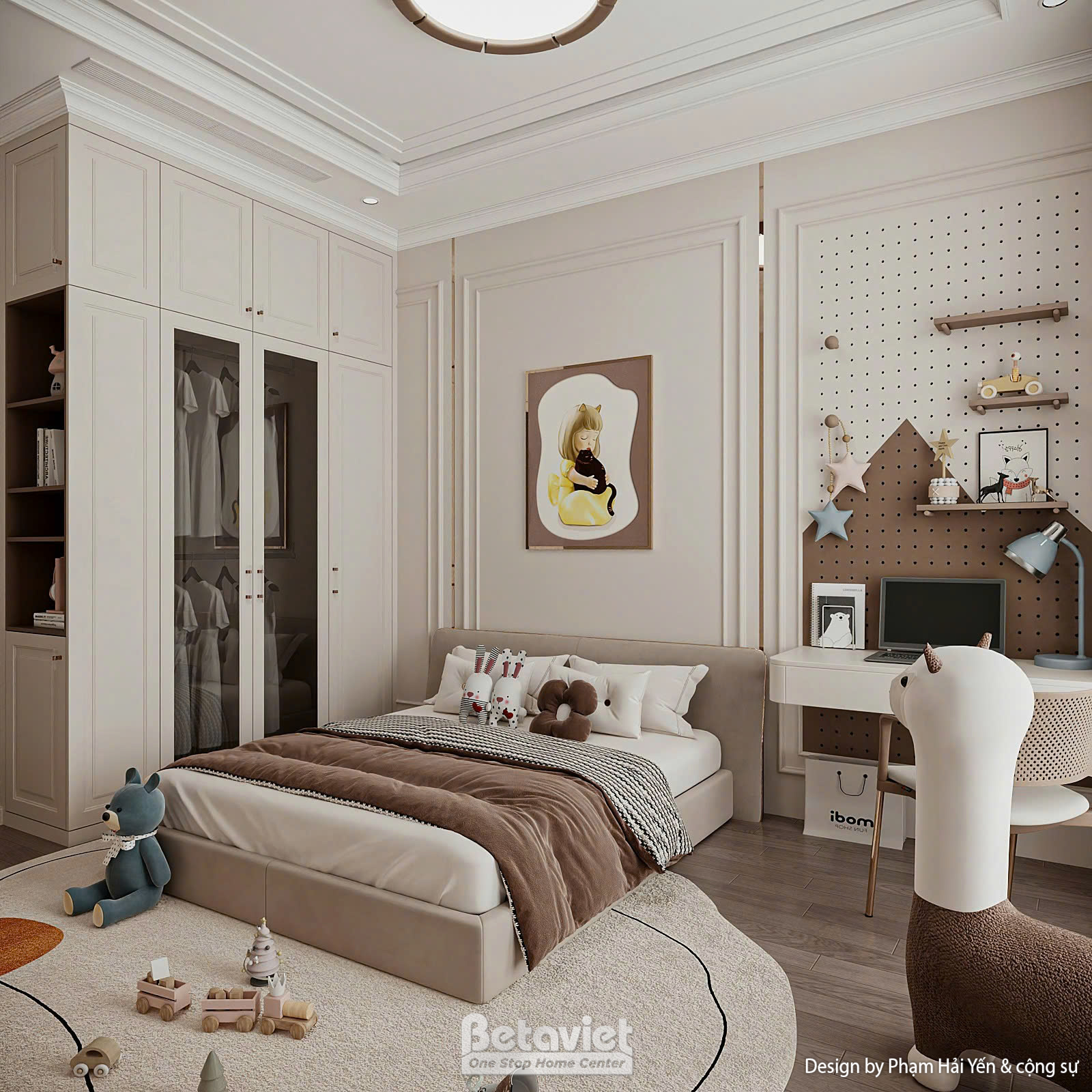 Tổng thể phòng ngủ hiện đại được xây dựng trên bảng màu trung tính cao cấp như trắng kem, be và nâu nhạt, tạo cảm giác nhẹ nhàng, dễ chịu nhưng vẫn toát lên vẻ đẳng cấp. Đây là gam màu rất được ưa chuộng trong các dự án căn hộ hạng sang, bởi khả năng mở rộng không gian thị giác và mang lại sự bền vững về mặt thẩm mỹ theo thời gian. Cách phối màu hài hòa giúp thiết kế nội thất phòng ngủ trở nên tinh giản nhưng không hề đơn điệu.