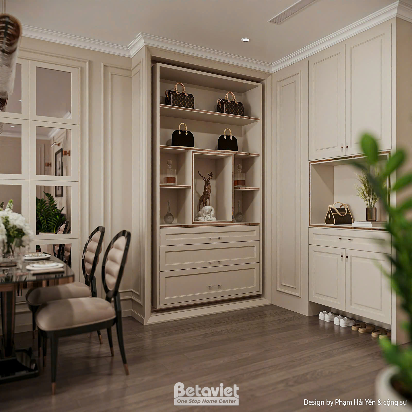 Hệ tủ quần áo cánh kính và tủ lưu trữ âm tường được bố trí khoa học, giúp tối ưu diện tích sử dụng mà vẫn đảm bảo sự gọn gàng, sang trọng. Đây là giải pháp đặc trưng của phòng ngủ hiện đại, nơi công năng và thẩm mỹ luôn song hành. Các hộc trang trí mở được sắp xếp khéo léo, vừa tăng không gian trưng bày phụ kiện, vừa góp phần hoàn thiện tổng thể thiết kế nội thất phòng ngủ.