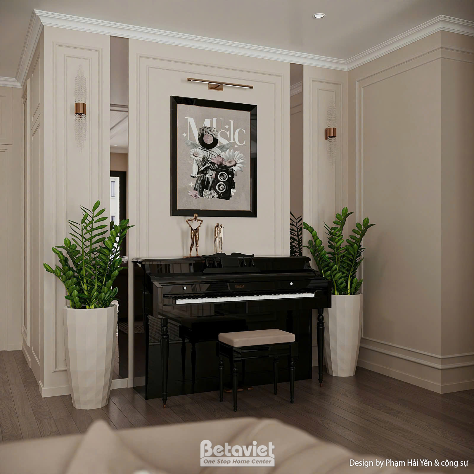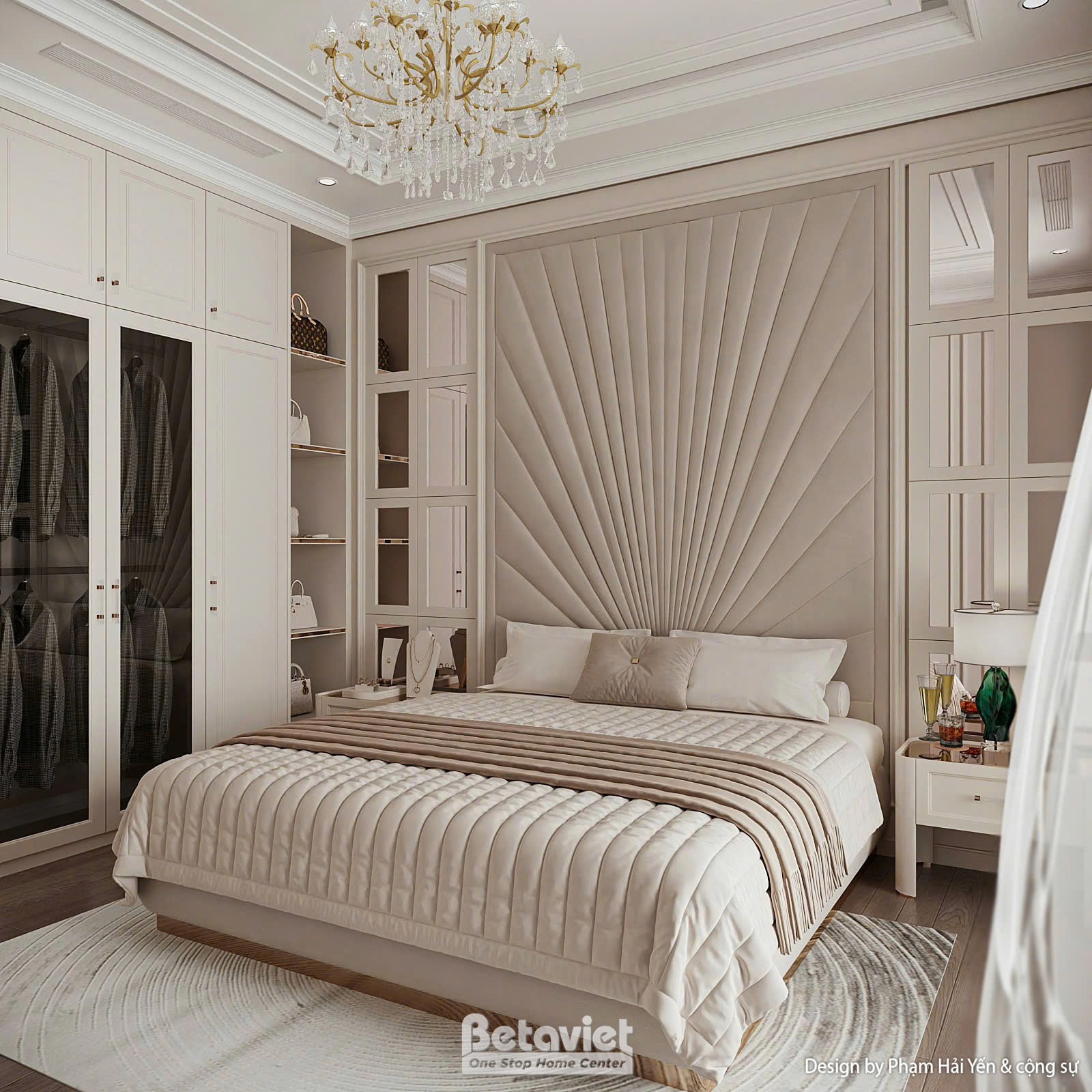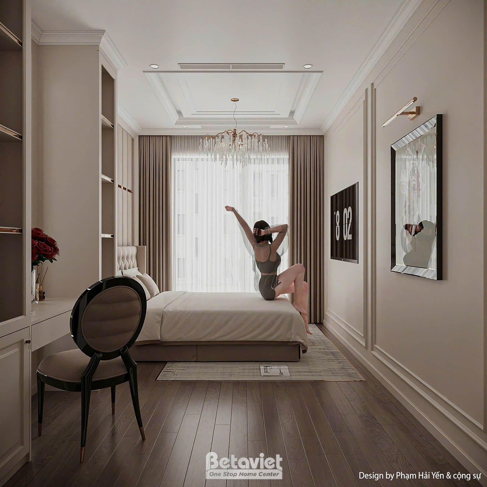 Ánh sáng trong phòng ngủ được xử lý tinh tế với sự kết hợp giữa đèn chùm pha lê trang trí, hệ đèn âm trần và ánh sáng tự nhiên từ cửa sổ lớn. Rèm cửa hai lớp giúp điều chỉnh ánh sáng linh hoạt, mang lại cảm giác riêng tư và thư giãn tuyệt đối. Cách bố trí ánh sáng này giúp phòng ngủ hiện đại luôn ấm áp, nhẹ nhàng và phù hợp cho cả nghỉ ngơi lẫn sinh hoạt cá nhân.