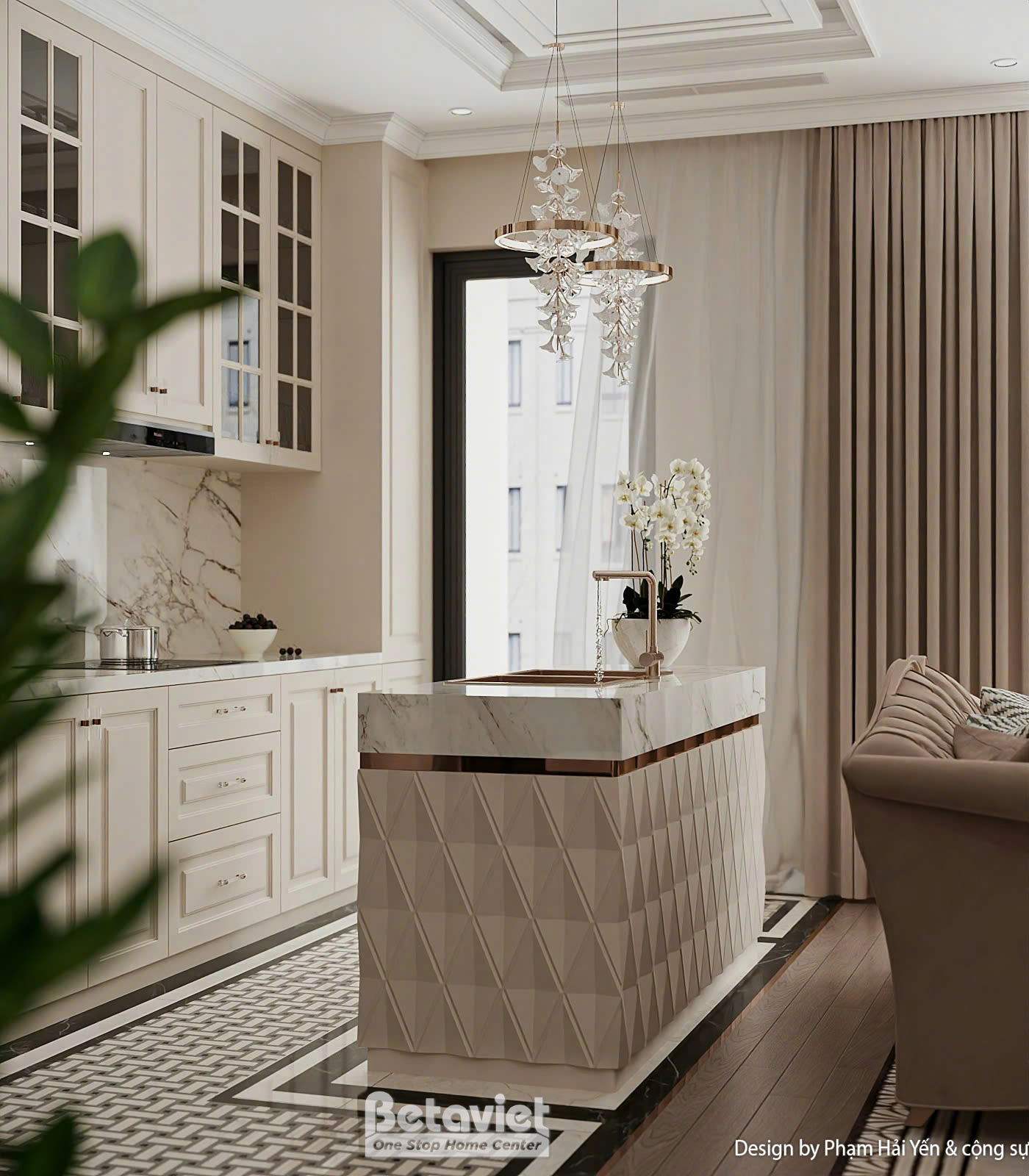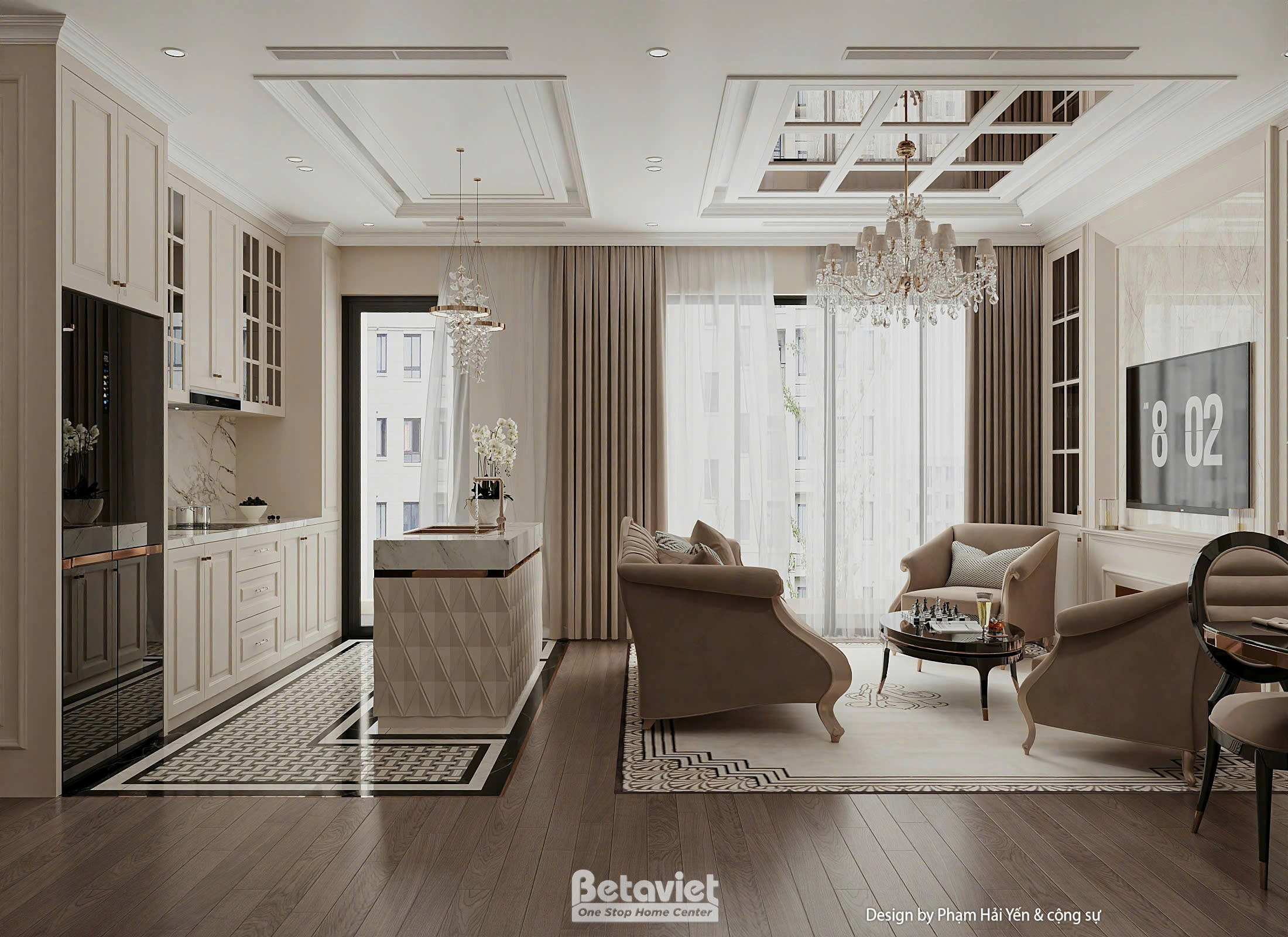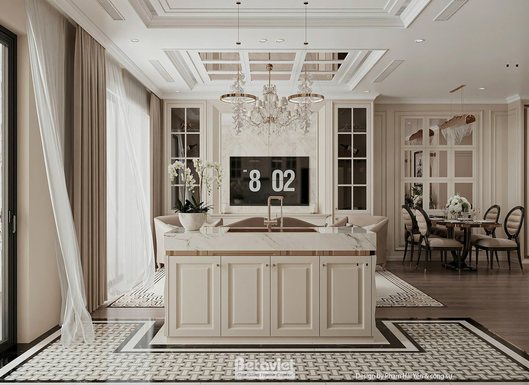 Ánh sáng trong phòng ngủ được xử lý tinh tế với sự kết hợp giữa đèn chùm pha lê trang trí, hệ đèn âm trần và ánh sáng tự nhiên từ cửa sổ lớn. Rèm cửa hai lớp giúp điều chỉnh ánh sáng linh hoạt, mang lại cảm giác riêng tư và thư giãn tuyệt đối. Cách bố trí ánh sáng này giúp phòng ngủ hiện đại luôn ấm áp, nhẹ nhàng và phù hợp cho cả nghỉ ngơi lẫn sinh hoạt cá nhân.