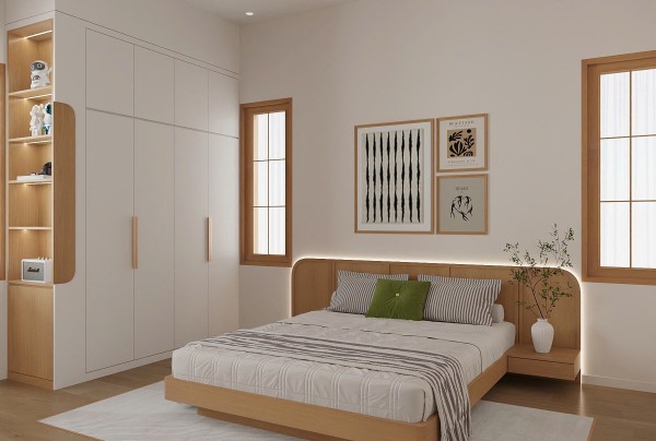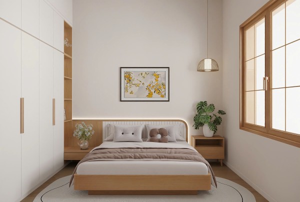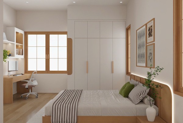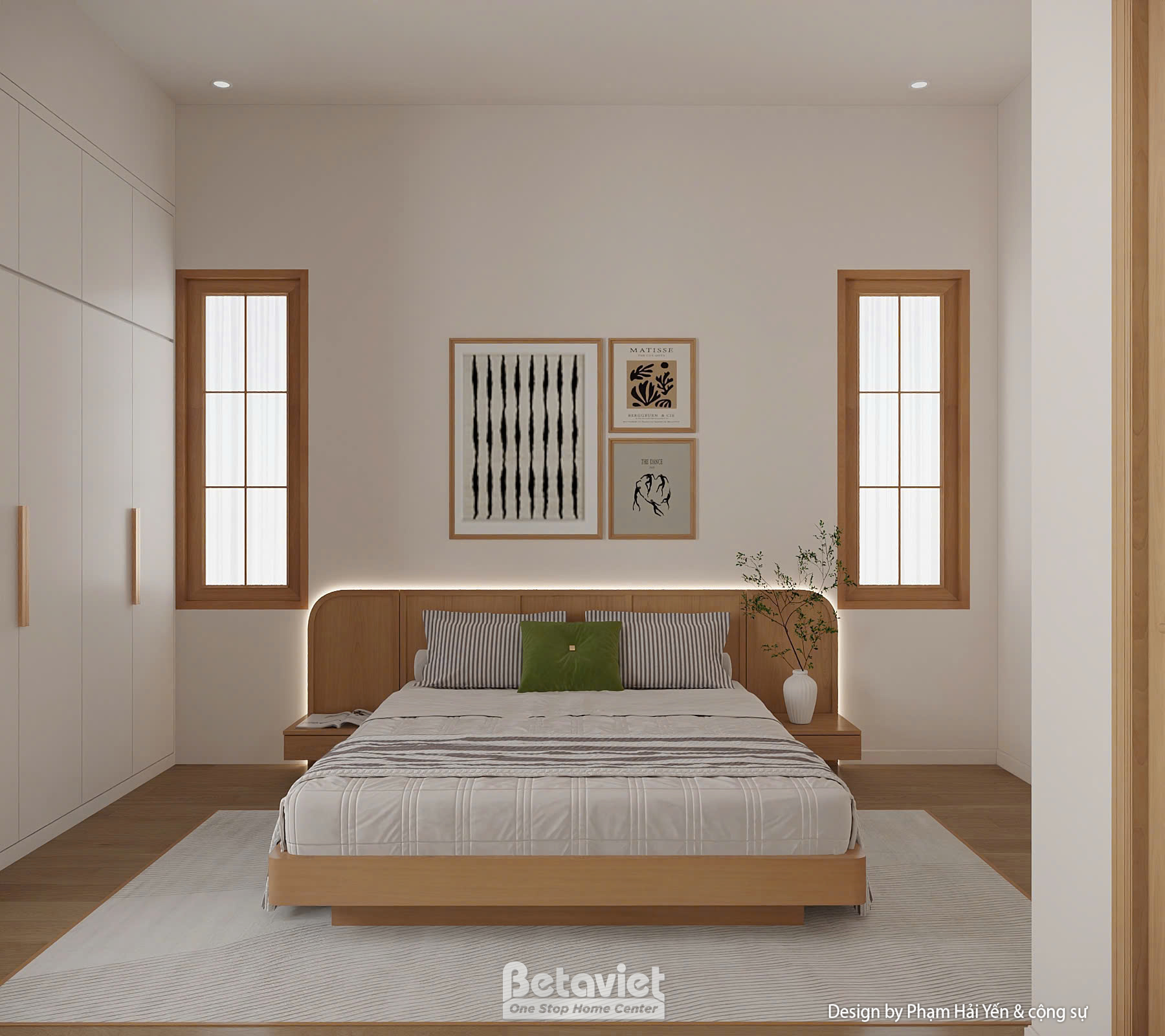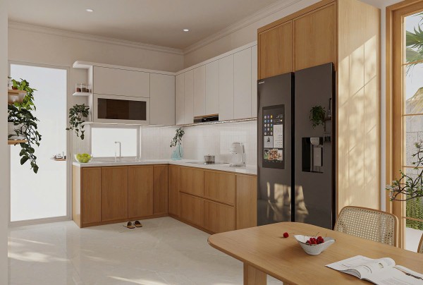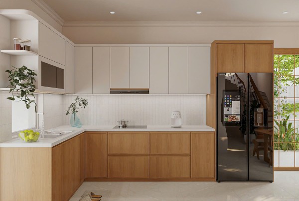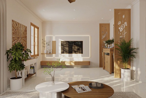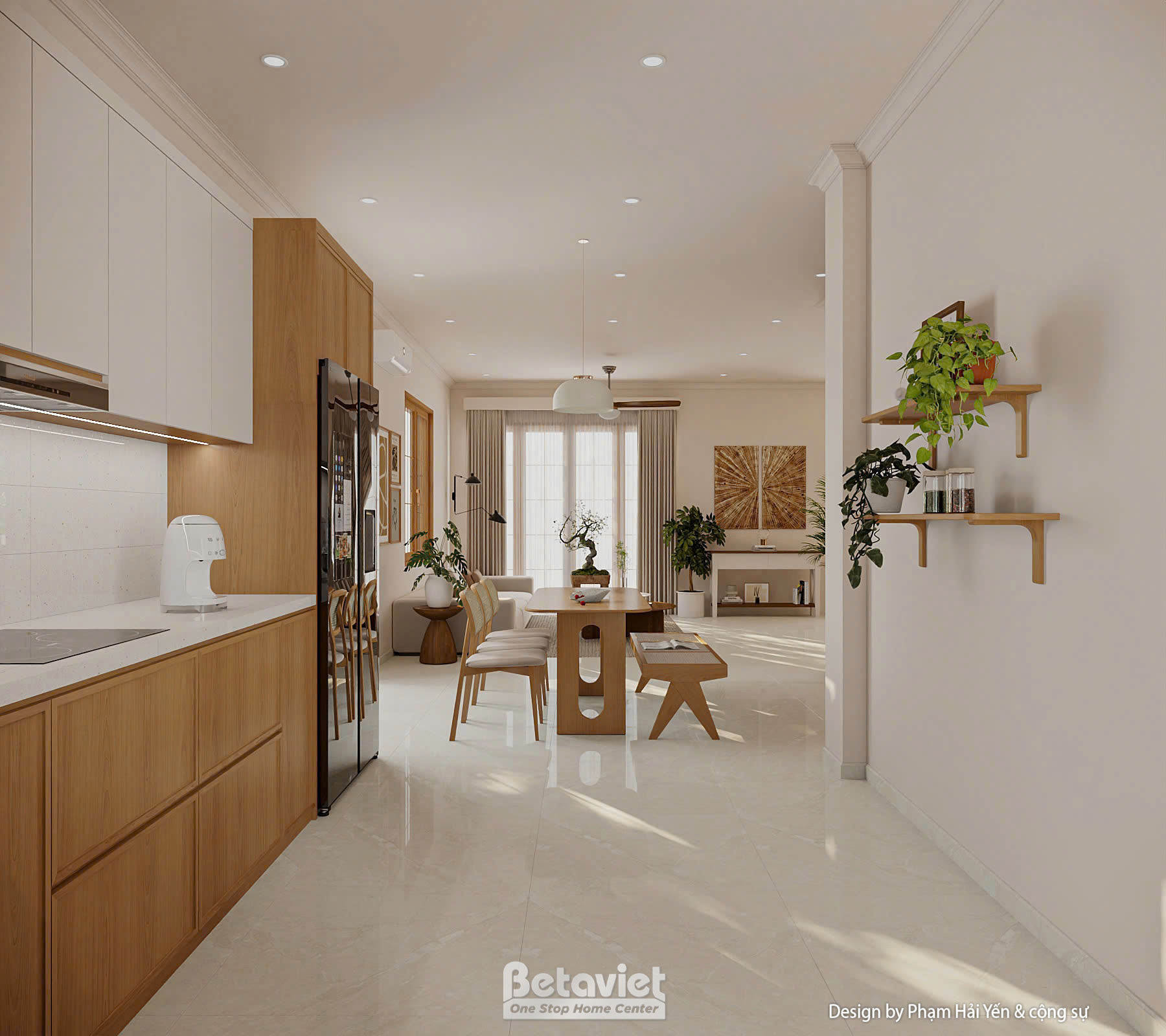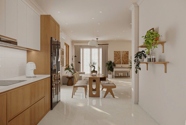 Bộ sofa dáng chữ L thấp, thiết kế đơn giản nhưng tinh tế, được bố trí gọn gàng sát tường, giúp tối ưu không gian sinh hoạt. Bàn trà tròn với sự kết hợp giữa gỗ và màu trắng tạo điểm nhấn nhẹ nhàng, hài hòa với tổng thể nội thất nhà phố. Thảm trải sàn tông trung tính giúp định hình khu vực tiếp khách, tăng chiều sâu và cảm giác êm ái cho không gian.