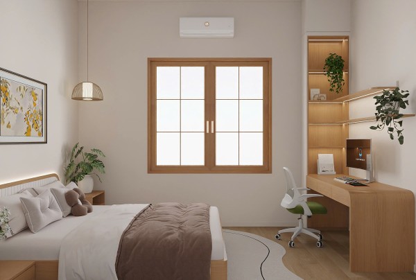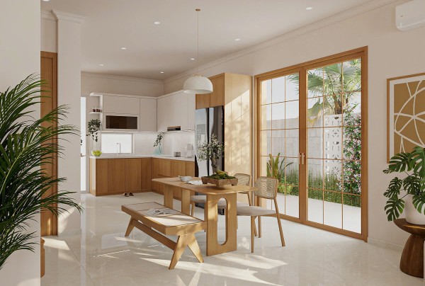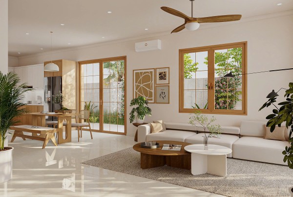 Hệ cửa sổ lớn và cửa trượt khung gỗ là điểm nhấn nổi bật trong thiết kế nội thất phòng khách hiện đại NT25891. Ánh sáng tự nhiên được khai thác tối đa, kết hợp mảng xanh bên ngoài giúp không gian luôn thông thoáng, thư giãn và giàu sinh khí. Đây là giá trị cốt lõi mà nội thất hiện đại cao cấp luôn hướng tới: mang thiên nhiên vào trong nhà.