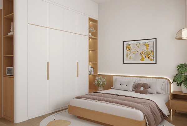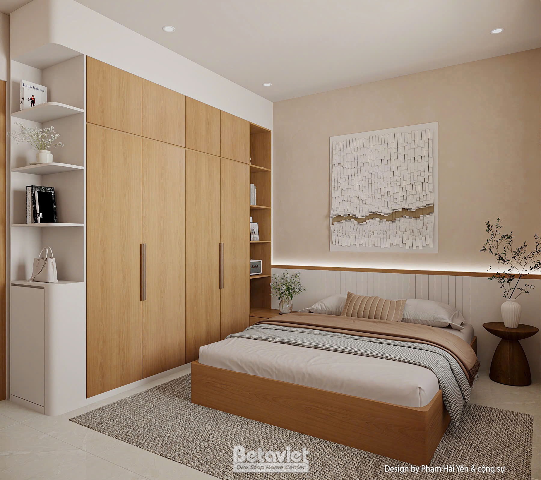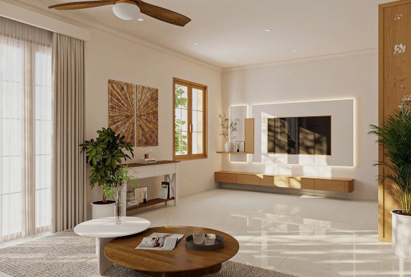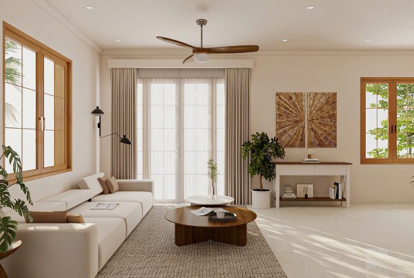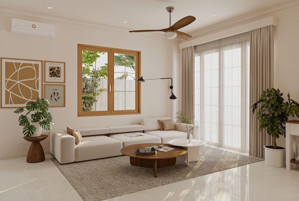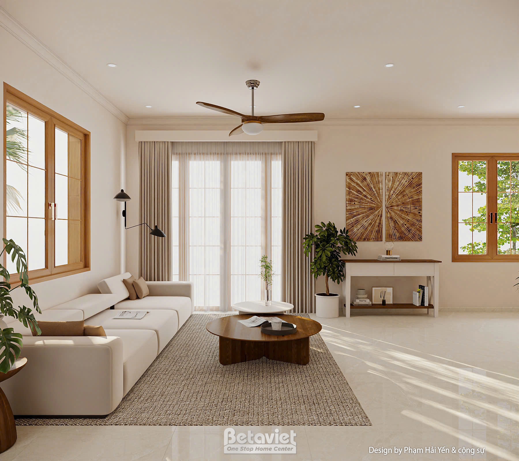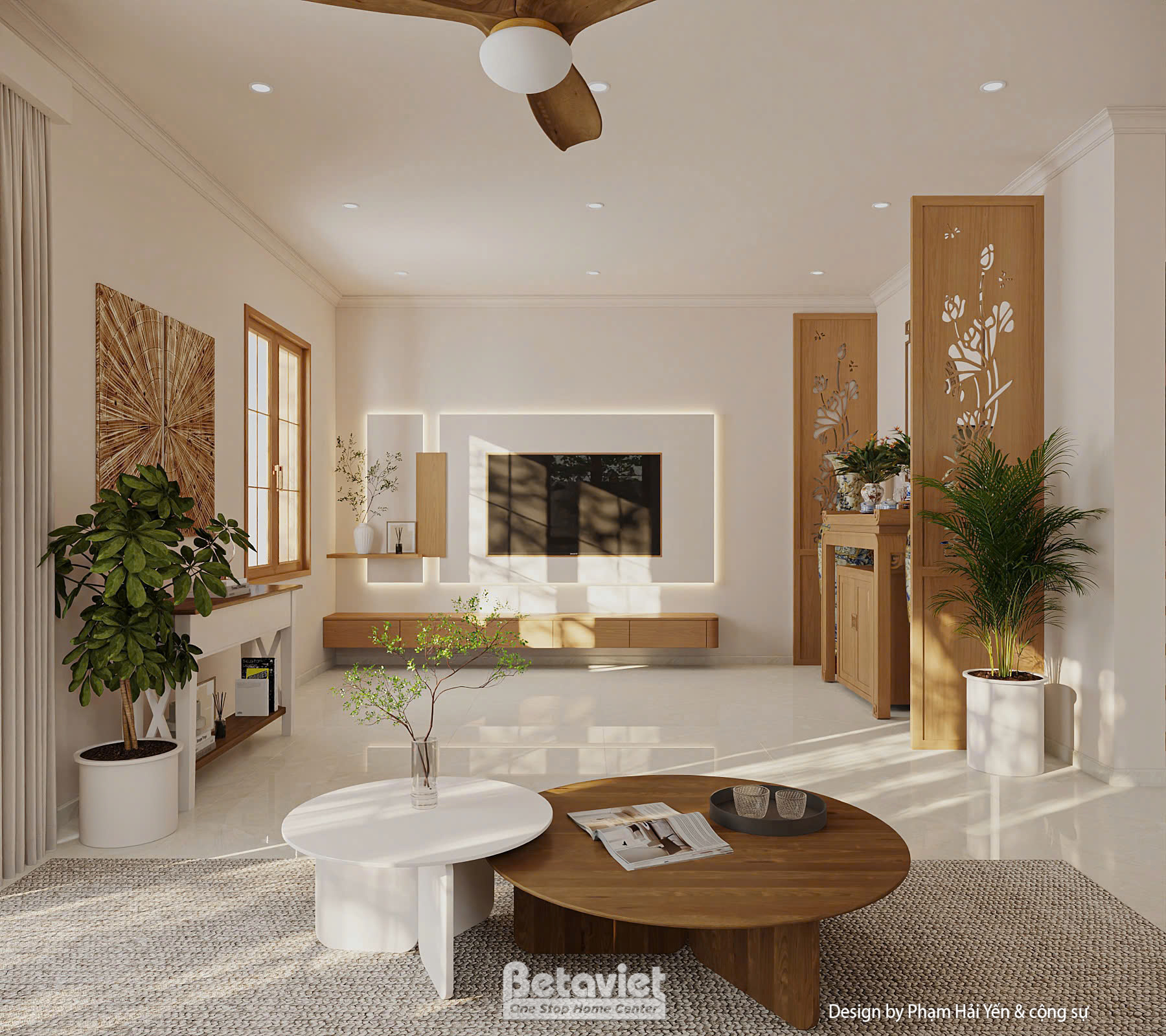 Quạt trần cánh gỗ, đèn âm trần và đèn thả được bố trí khoa học, vừa đảm bảo công năng chiếu sáng – thông gió, vừa giữ cho trần nhà gọn gàng, thanh thoát. Khu vực tường được trang trí vừa đủ bằng tranh nghệ thuật, cây xanh và kệ console nhỏ, thể hiện rõ tinh thần tiết chế trong thiết kế nội thất phòng khách hiện đại, tránh rườm rà nhưng vẫn sang trọng.