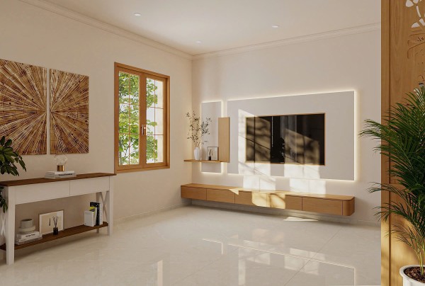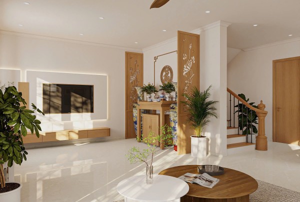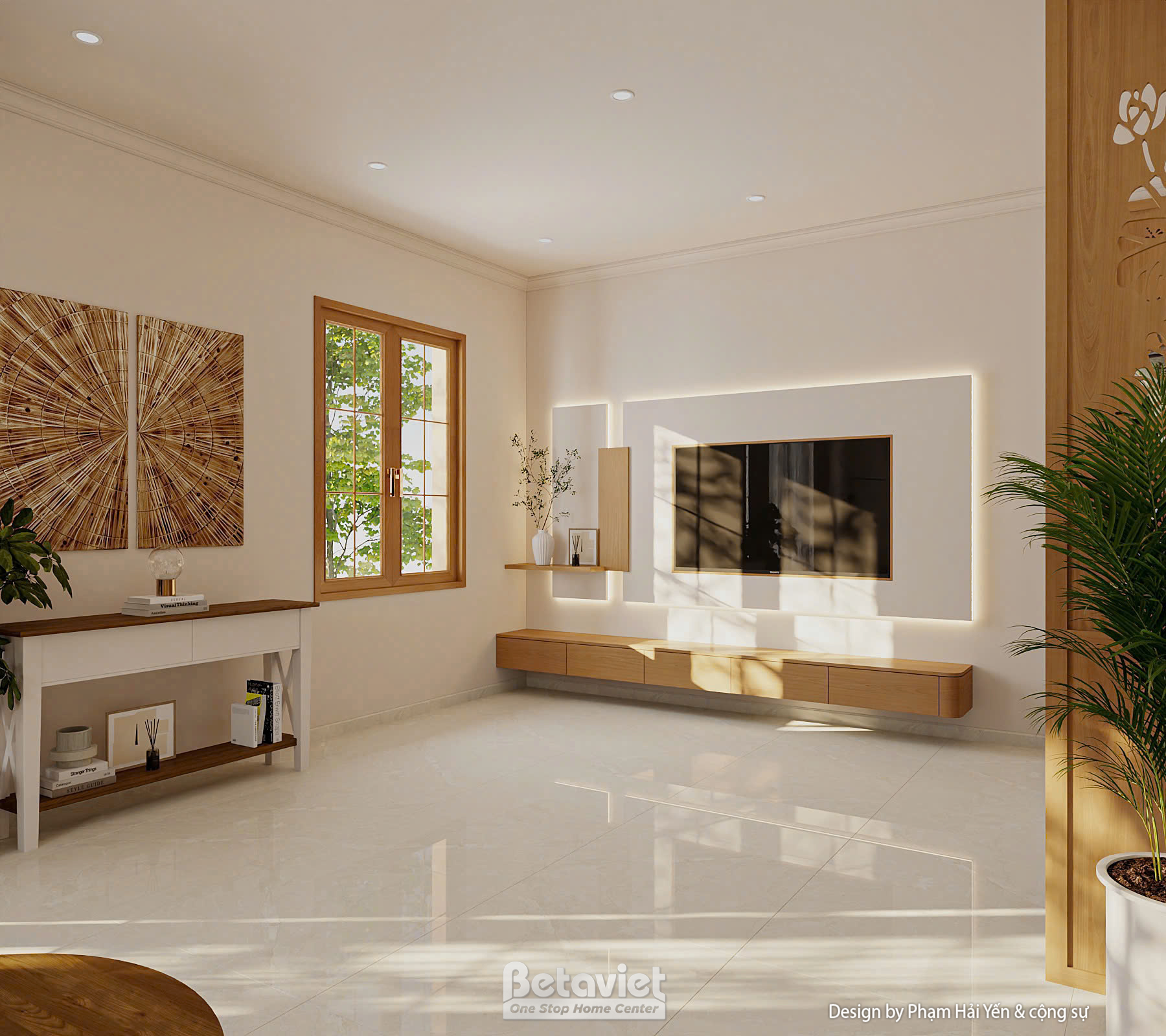 Không gian phòng khách sử dụng bảng màu trung tính chủ đạo gồm trắng, kem và be, kết hợp vật liệu gỗ tự nhiên tạo cảm giác ấm áp, sang trọng và dễ chịu. Cách phối màu này giúp nội thất hiện đại không bị lỗi thời, đồng thời phù hợp với nhiều nhóm tuổi gia chủ từ 30–60. Sàn nhà lát bóng sáng góp phần mở rộng thị giác, tối ưu diện tích – một giải pháp rất thông minh trong thiết kế nội thất phòng khách hiện đại cho nhà phố.