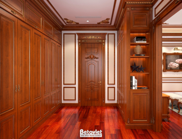 Ngoài ra, các chi tiết như kệ trang trí mở, ô trang trí decor tinh tế, hệ thống cửa gỗ đồng bộ và sàn gỗ đỏ cao cấp giúp hoàn thiện vẻ đẹp đồng nhất, sang trọng cho phòng thay đồ NT18127. Đây không chỉ là không gian phục vụ nhu cầu cá nhân, mà còn là nơi thể hiện phong cách sống, sự chỉnh chu và tinh tế của chủ nhân căn biệt thự.