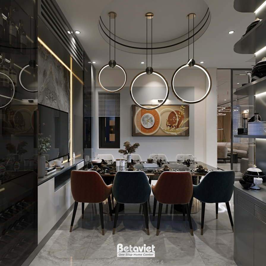 Phòng ăn trong biệt thự hiện đại NT5500025 được xem là “trái tim ấm áp” của ngôi nhà, nơi không chỉ phục vụ nhu cầu ẩm thực mà còn là không gian kết nối các thế hệ trong mỗi bữa cơm gia đình. Với lối thiết kế tinh tế, hiện đại và đậm chất nghệ thuật, nội thất phòng ăn tại đây mang đến trải nghiệm dùng bữa đẳng cấp, thoải mái và đầy cảm xúc.