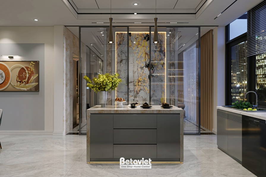 Không gian xung quanh được xử lý tinh tế với hệ tủ trưng bày âm tường kết hợp cánh kính trong suốt và đèn led chiếu điểm. Đây là nơi gia chủ có thể trưng bày các bộ ly tách cao cấp, bình hoa nghệ thuật hoặc những món đồ lưu niệm có giá trị. Cách bố trí này không chỉ tiết kiệm diện tích mà còn nâng tầm không gian sống bằng sự hiện diện của tính cá nhân hóa rõ nét.