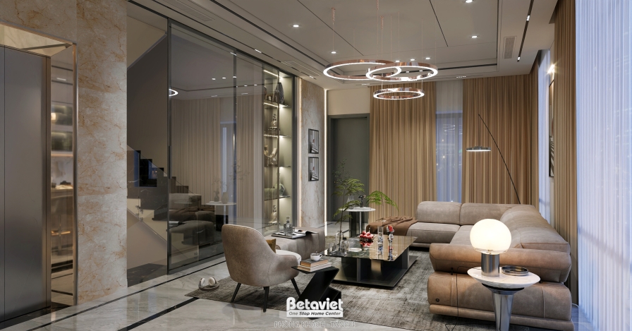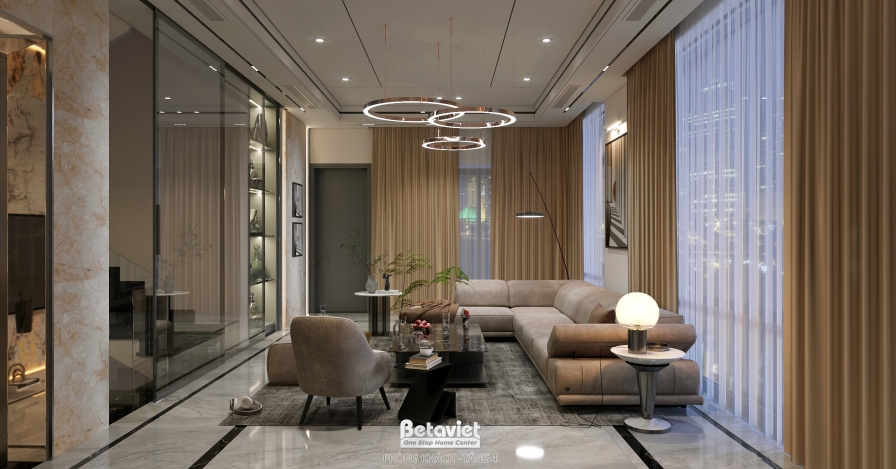 Trong dự án thiết kế nội thất biệt thự hiện đại NT5500025, phòng khách không chỉ đơn thuần là nơi đón tiếp khách quý, mà còn là “bộ mặt” thể hiện rõ nét nhất phong cách sống, cá tính và gu thẩm mỹ của gia chủ. Không gian này được đội ngũ thiết kế đầu tư chỉn chu về cả hình thức lẫn công năng, tạo nên một tổng thể hài hòa giữa kiến trúc đương đại và nghệ thuật bài trí nội thất.