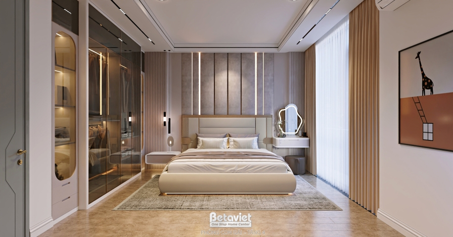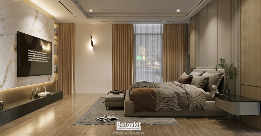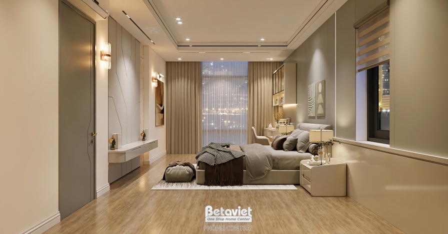 Phòng ngủ sử dụng bảng màu trung tính sang trọng với các gam be, xám nhạt và nâu ấm, tạo cảm giác nhẹ nhàng, thư thái ngay khi bước vào. Trần cao, kết hợp hệ rèm hai lớp và cửa kính lớn giúp không gian luôn thông thoáng, đón trọn ánh sáng tự nhiên vào ban ngày và giữ được sự riêng tư, yên tĩnh vào ban đêm.