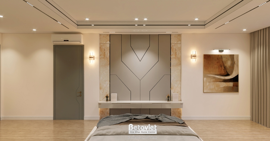 Chiếc giường ngủ trung tâm được thiết kế theo phong cách hiện đại, khung giường bọc da cao cấp màu be nhạt, với phần đầu giường lớn chần chỉ sang trọng, vừa tạo cảm giác êm ái khi tựa lưng, vừa là điểm nhấn nhẹ nhàng trong không gian. Hai bên là tab đầu giường tích hợp đèn ngủ gắn tường ánh sáng ấm, giúp tiết kiệm diện tích và làm tăng chiều sâu không gian vào ban đêm.