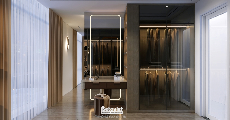 Một trong những điểm nổi bật nhất của phòng ngủ master NT5500025 chính là khu vực phòng thay đồ riêng biệt. Không gian này được thiết kế mở, sử dụng hệ tủ quần áo cánh kính trong suốt kết hợp khung kim loại mảnh và hệ đèn LED chiếu sáng bên trong. Cách bố trí này không chỉ giúp việc lựa chọn trang phục trở nên thuận tiện mà còn biến phòng thay đồ thành một không gian trưng bày thời trang sang trọng, đúng chuẩn thiết kế nội thất biệt thự cao cấp.