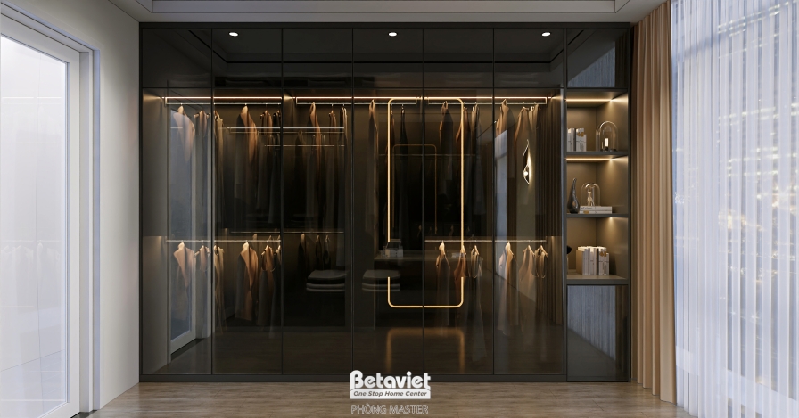 Tủ quần áo cánh kính trong suốt, chia ngăn khoa học, tích hợp đèn LED chiếu sáng tự động là điểm nhấn hiện đại đậm chất “boutique-style”. Đây không chỉ là nơi lưu trữ trang phục mà còn là góc trưng bày thời trang cá nhân, thể hiện cá tính và gu thẩm mỹ tinh tế của chủ nhân căn phòng.