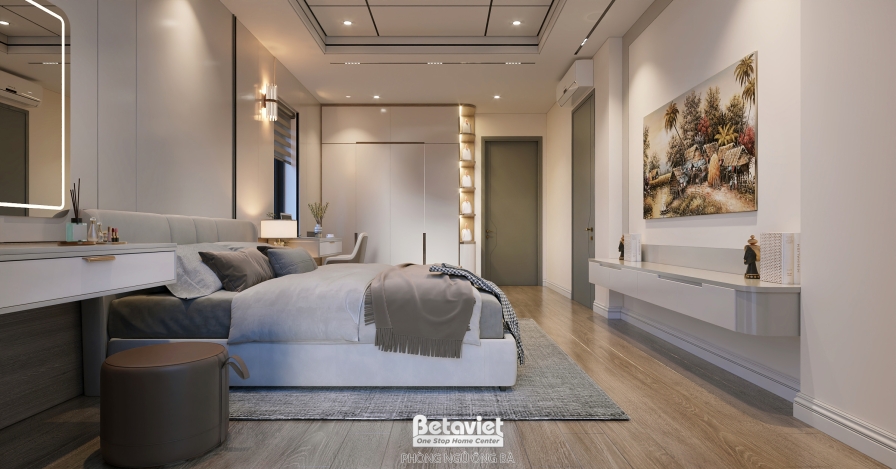 Ngay từ cái nhìn đầu tiên, phòng ngủ tạo thiện cảm bởi bảng màu chủ đạo gồm kem sữa, trắng ngà và be nhẹ nhàng, mang đến sự dịu mắt, thư thái và dễ chịu. Những gam màu này không chỉ giúp mở rộng không gian về mặt thị giác mà còn là lựa chọn lý tưởng để tạo nên bầu không khí thư giãn, nữ tính và dễ dàng phối hợp với các chất liệu nội thất cao cấp khác.