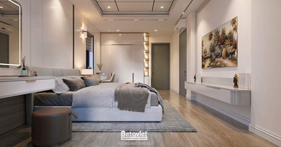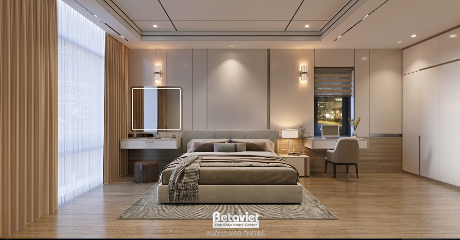Toàn bộ căn phòng sử dụng bảng màu dịu nhẹ, trong đó chủ đạo là gam be sáng, nâu nhạt và kem trung tính, giúp tạo cảm giác dễ chịu, thư thái cho thị giác. Những tông màu này còn có tác dụng làm dịu tâm trạng, hỗ trợ tốt cho giấc ngủ – điều rất quan trọng đối với người lớn tuổi. Tường được sơn nhám mịn, kết hợp các chi tiết phào chỉ nhẹ nhàng tạo điểm nhấn mà vẫn đảm bảo sự tối giản đặc trưng của nội thất hiện đại.