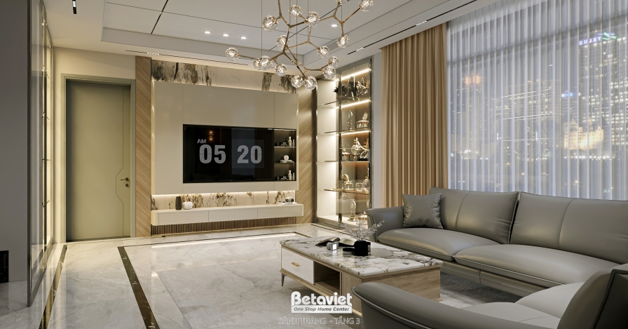 Không thể không kể đến hệ thống đèn trần nghệ thuật mang thiết kế hiện đại, gồm những vòng kim loại kết nối bất đối xứng, thả từ trần xuống giữa phòng – vừa tạo điểm nhấn thị giác, vừa là “trái tim ánh sáng” của không gian phòng khách. Bên cạnh đó, hệ tủ trưng bày âm tường thiết kế tinh gọn, ốp kính phản chiếu, kết hợp đèn led chiếu điểm, là nơi lý tưởng để gia chủ trưng bày những món đồ lưu niệm cao cấp, sưu tầm nghệ thuật hay các vật phẩm phong thủy mang giá trị cá nhân.
