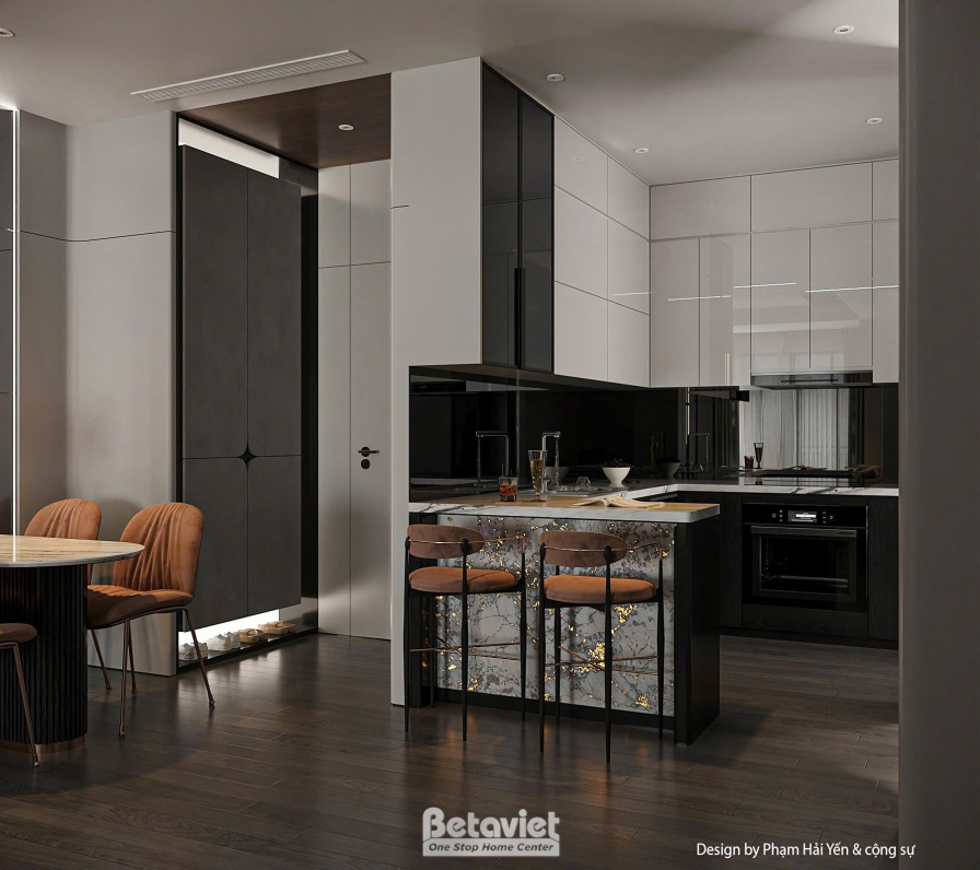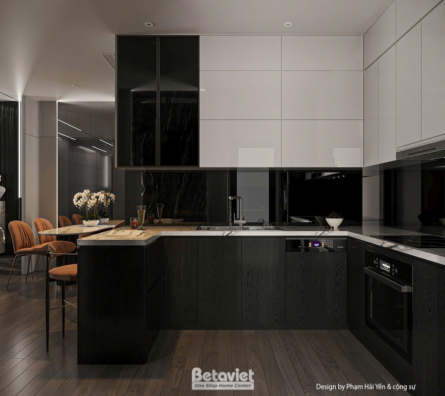 Thiết kế phòng bếp chung cư trong NT26101 được thiết lập với bố cục chữ U hợp lý, tối đa hóa dụng tích và tự nhiên hóa quy trình nấu nướng. Hệ tủ bếp Acrylic trắng – đen bóng gương, tay nắm ẩn và hệ kệ trên dưới tích hợp với thiết bị bếp cao cấp mang lại tự tiện nghi đến tối đa.