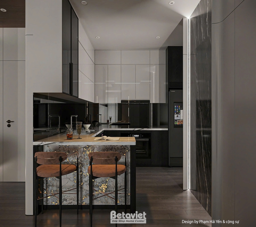 Tất cả thiết bị bếp như lò nướng, bếp từ, máy rửa bát, tủ lạnh đều được giấu gọn sau các khối tủ âm tường, giúp cả không gian ngăn nắp góc chật và thông thoáng hơn. Tất cả đều hướng đến một mục tiêu chung: không gian bếp vừa sang trọng, vừa đáng sống.