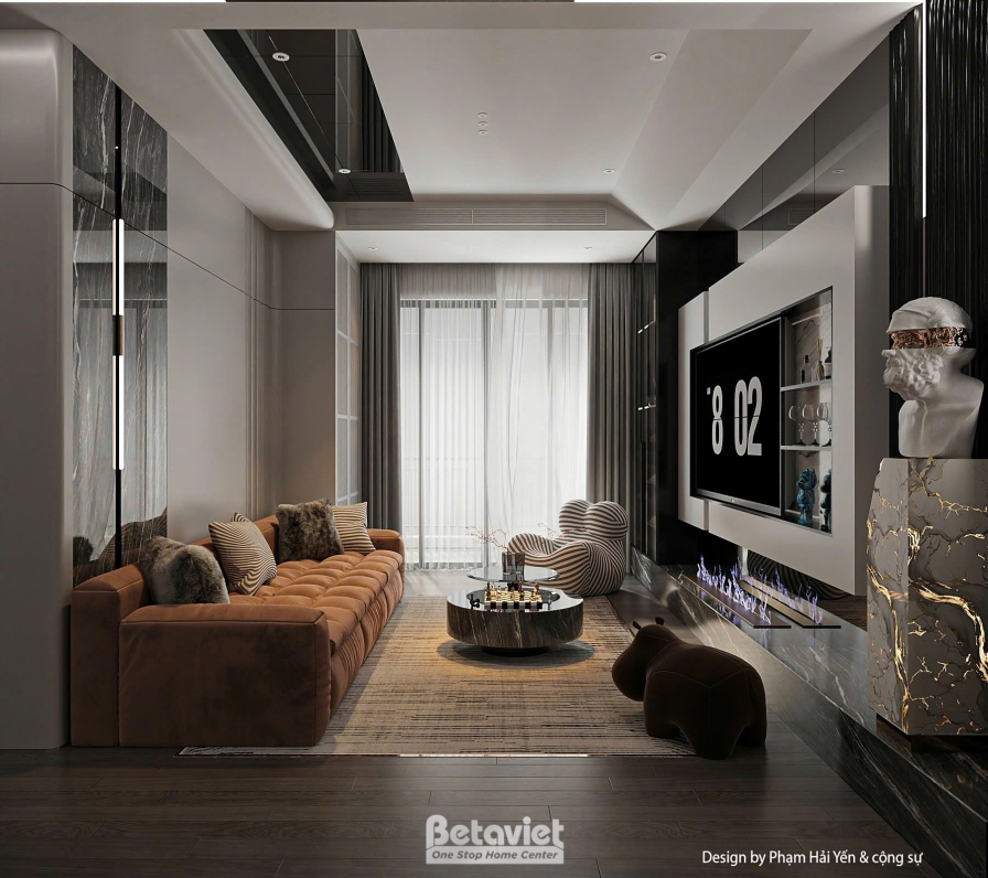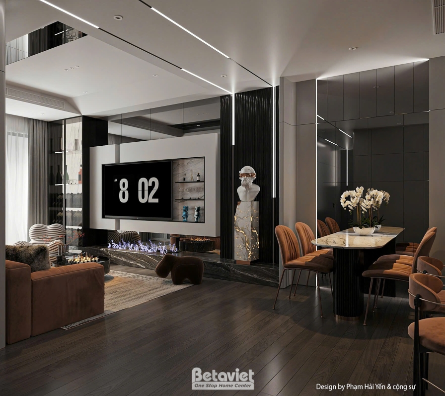 Tính năng thẩm mỹ được đẩy đến cao độ nhờ hệ vách TV đặc biệt, kết hợp kệ rượu âm và lò sưởi LED mang hơi hướm châu Âu. Điểm nhấn nghệ thuật đặc biệt là bài trí tượng bán thân trên bệ đá vân mạ vàng, thể hiện gu thẩm mỹ và cá tính của chủ nhân.