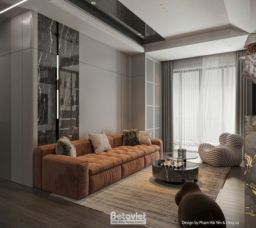 Toàn bộ không gian được bao trùm bởi tông màu trung tính đề cao: nâu trầm, đen huyền, xám lông chuột và trắng thanh lịch. Chiếc sofa nhung nâu đứng dáng thấp, kết hợp bàn trà đôi mặt đá đen bóng, góp phần tô đậm vẻ đẹp thông minh và tinh tế.