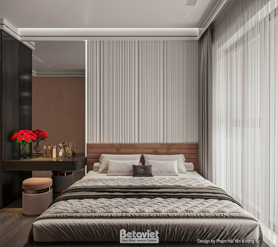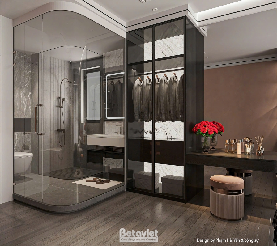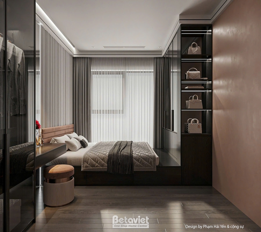 Tông xám nâu ấm áp được áp dụng xuyên suốt, giúp mang lại cảm giác thư giãn, ổn định và đáng tin cậy – rất phù hợp cho không gian nghỉ ngơi cá nhân. Bàn trang điểm bố trí tại vị trí đón ánh sáng tự nhiên, đem đến trải nghiệm dùng dịch vụ makeup, skincare thoải mái như ở spa.