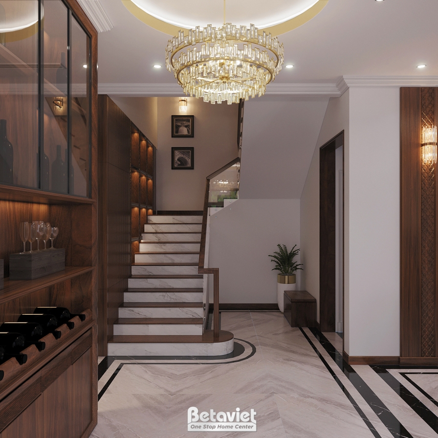 Khu vực cầu thang lát đá trắng, tay vịn gỗ và hệ tủ trưng bày âm tường có đèn chiếu điểm tạo nên một tổ hợp hoàn hảo giữa tiện ích và thẩm mỹ. Đặc biệt, tủ rượu âm tường với chất liệu gỗ óc chó và kính cường lực là điểm nhấn thể hiện phong cách sống thời thượng.