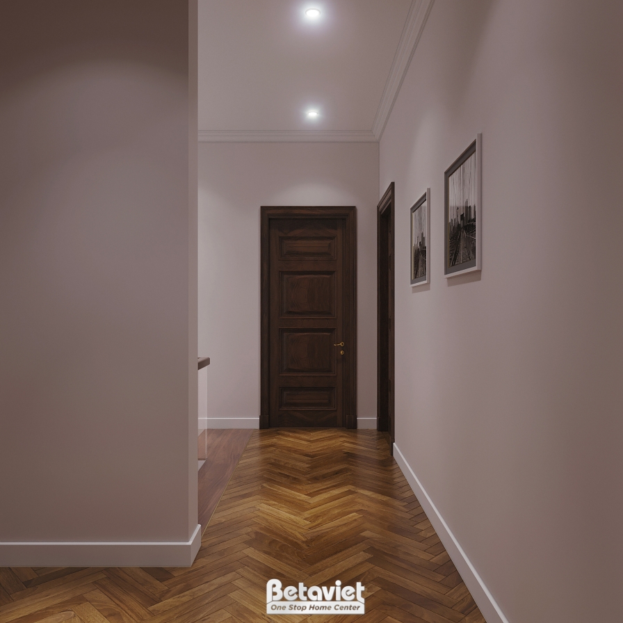 Tổng thể phòng khách sử dụng tông màu nâu trầm sang trọng – gam màu đặc trưng của gỗ óc chó tự nhiên nhập khẩu. Chất liệu gỗ được xử lý công nghệ cao, giữ nguyên đường vân lượn sóng tự nhiên, kết hợp với đá ốp tường xuyên sáng mang lại chiều sâu không gian và sự sang trọng đầy tinh tế. Bề mặt sàn gỗ xương cá cùng ánh sáng vàng từ hệ thống đèn LED âm trần tạo nên hiệu ứng ánh sáng ấm áp, dễ chịu, làm nổi bật lên từng chi tiết nội thất đắt giá.
