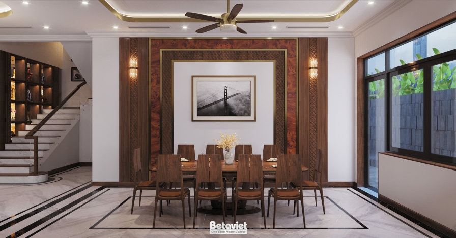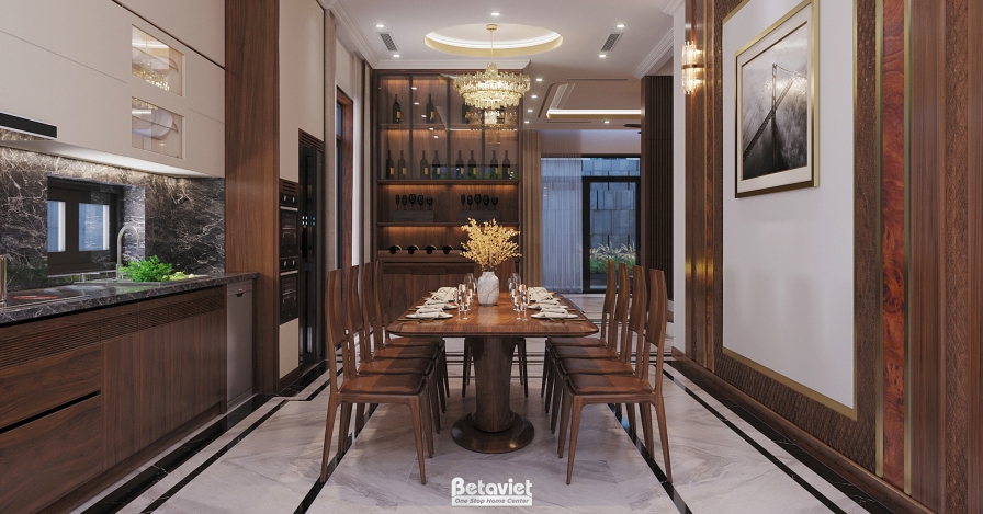 Thiết kế mở giúp phòng bếp liên thông tự nhiên với phòng khách và sảnh chính, tạo nên một dòng chảy liền mạch về không gian. Giải pháp này không chỉ tối ưu hóa diện tích mà còn giúp ánh sáng và khí lưu thông tốt, giữ cho khu vực bếp luôn khô thoáng, sạch sẽ và tiện nghi. Điều đặc biệt ấn tượng là sự đồng bộ về ngôn ngữ thiết kế – gỗ óc chó tiếp tục là chất liệu chủ đạo, tạo nên sự sang trọng và thống nhất trong toàn bộ không gian biệt thự.