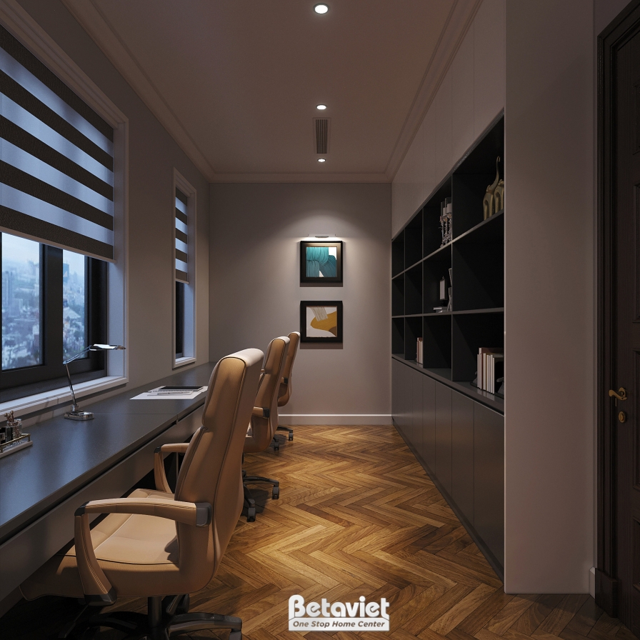 Phòng học được thiết kế theo dạng chẻ dài, sử dụng ánh sáng tự nhiên tối đa từ hệ thống cửa sổ lớn kết hợp rèm cản sáng hai lớp. Bàn học liền mạch dài, ghế ngồi công thái học bọc da cao cấp, giúp tạo tư thế ngồi chuẩn và hạn chế mỏi cổ, đau lưng khi làm việc lâu.