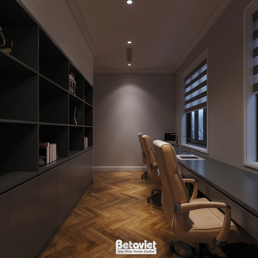 Hệ tủ sách âm tường tối màu tạo điểm nhấn chiều sâu cho không gian, đồng thời giúp sắp xếp tài liệu, sách vở một cách khoa học. Đây là không gian lý tưởng cho cả người lớn làm việc và trẻ nhỏ học tập tại nhà.