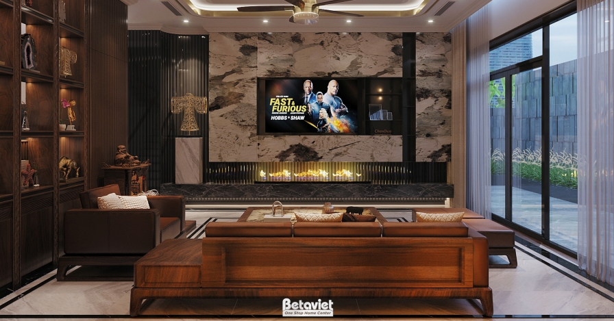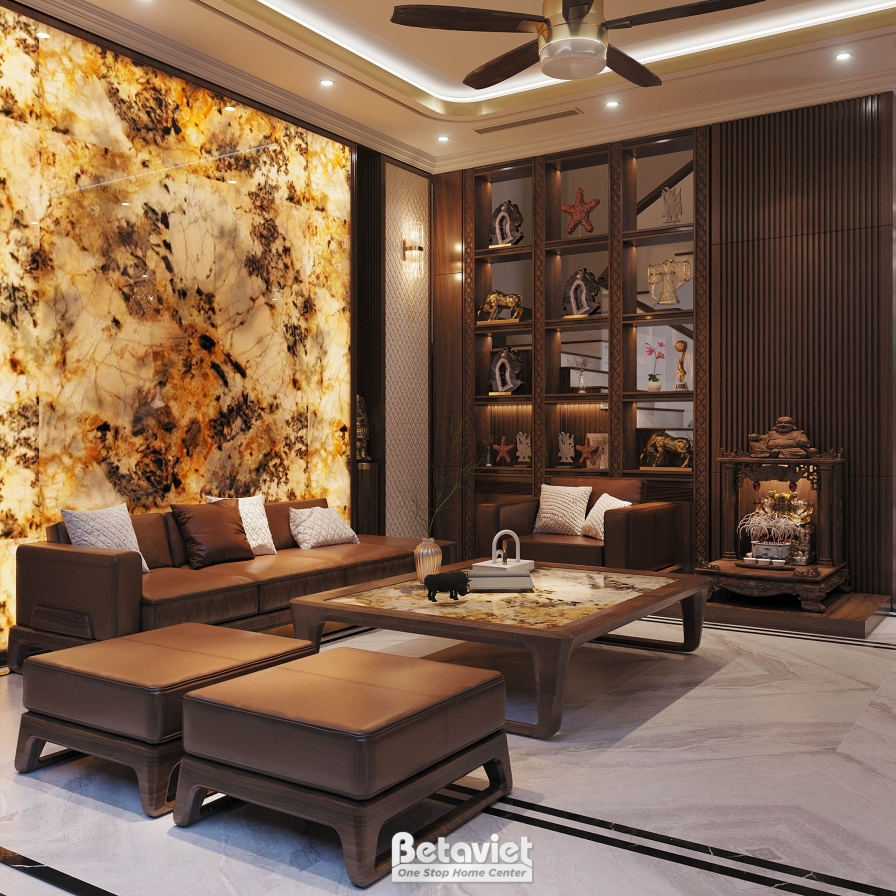 Nổi bật trong không gian là bộ sofa gỗ thiết kế vuông vức, mạnh mẽ, kết hợp phần đệm bọc da cao cấp với màu nâu nhạt nhẹ nhàng, tạo cảm giác êm ái và ấm cúng khi sử dụng. Bàn trà trung tâm với mặt đá vân mây tự nhiên – vừa là điểm nhấn thẩm mỹ, vừa tăng độ tương phản với chất liệu gỗ xung quanh. Phía sau sofa, tủ trưng bày âm tường thiết kế hiện đại với ánh sáng hắt khéo léo giúp tăng chiều sâu thị giác và tối ưu không gian lưu trữ.