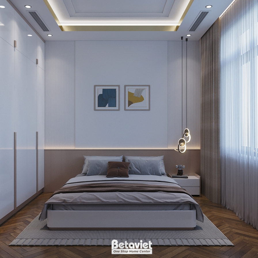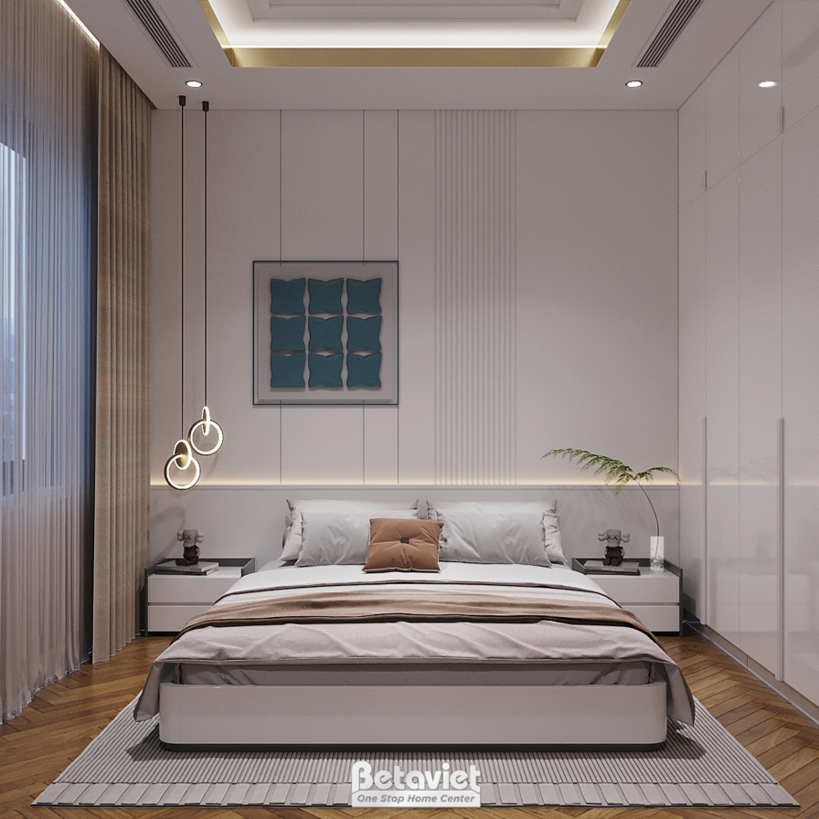 Tường được sơn màu trung tính như be sáng hoặc xám nhạt, kết hợp hài hòa cùng sàn gỗ xương cá và rèm cửa hai lớp, vừa giữ được sự riêng tư, vừa đảm bảo ánh sáng linh hoạt theo từng thời điểm trong ngày. Không gian tuy tối giản nhưng vẫn được điểm xuyết bằng tranh nghệ thuật kích thước vừa phải và đèn thả đầu giường ánh sáng ấm, giúp tăng chiều sâu và cảm xúc cho căn phòng.