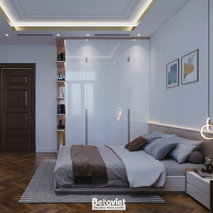 Hệ tủ quần áo âm tường được bố trí sát tường với thiết kế phẳng, tay nắm âm, giúp tiết kiệm diện tích và tạo sự liền mạch cho không gian. Nội thất không thừa, không thiếu – mọi chi tiết đều hướng đến sự gọn gàng và tiện nghi trong sử dụng hằng ngày. Ngay cạnh tủ là một góc bàn học nhỏ gọn, được bố trí gần cửa sổ nhằm tận dụng ánh sáng tự nhiên, tạo điều kiện lý tưởng cho việc học tập, làm việc hoặc đọc sách.