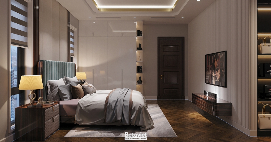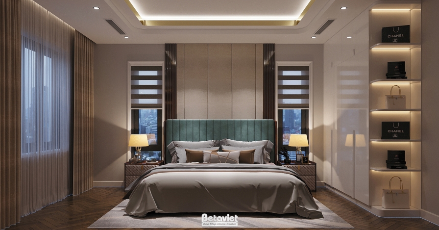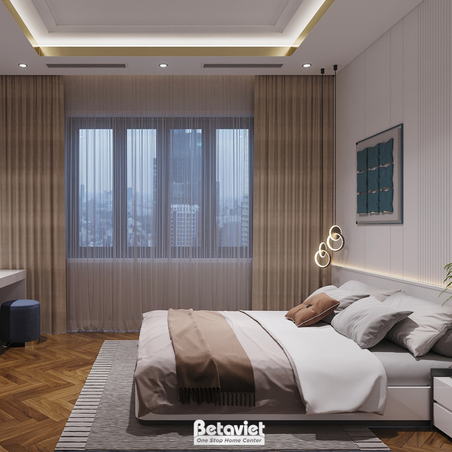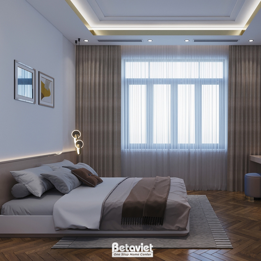 Ánh sáng tự nhiên được khai thác tối đa thông qua khung cửa sổ lớn với hệ rèm hai lớp – lớp voan mỏng giúp lấy sáng nhẹ nhàng vào ban ngày, trong khi lớp rèm dày đảm bảo sự riêng tư và tối ưu giấc ngủ vào ban đêm. Sự kết hợp này mang đến bầu không khí dễ chịu, gần gũi thiên nhiên, đồng thời giữ được nét sang trọng đặc trưng của biệt thự cao cấp.