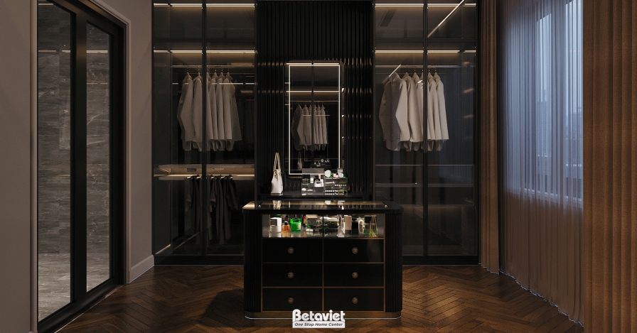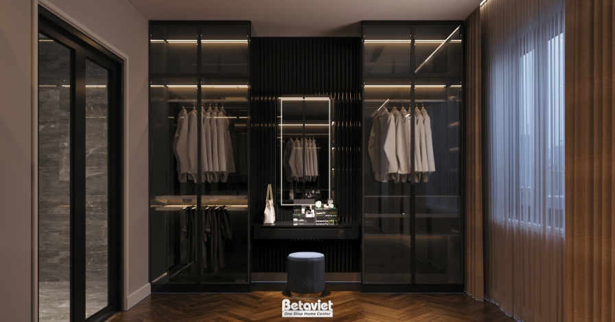 Hệ tủ quần áo âm tường cánh kính trong suốt kết hợp đèn LED chiếu sáng bên trong không chỉ giúp gia chủ dễ dàng quan sát, lựa chọn trang phục mà còn tạo hiệu ứng thị giác hiện đại, sang trọng. Thiết kế này đồng thời giúp không gian trở nên gọn gàng, liền mạch và rộng rãi hơn. Bàn trang điểm hiện đại được đặt gần cửa sổ, kết hợp gương soi lớn và ghế bọc nệm êm ái, tạo nên một góc làm đẹp riêng tư, đầy cảm hứng.