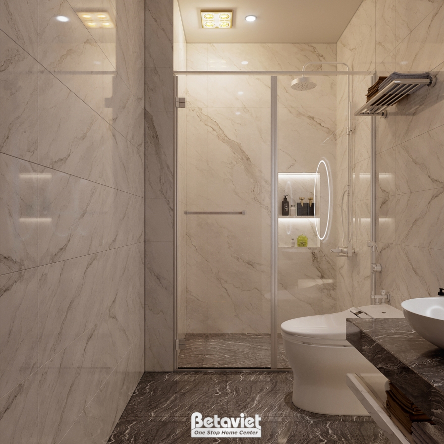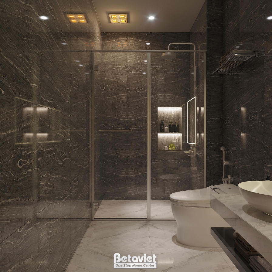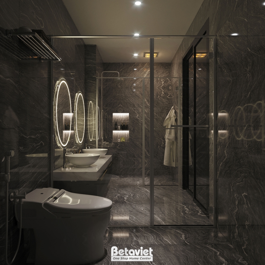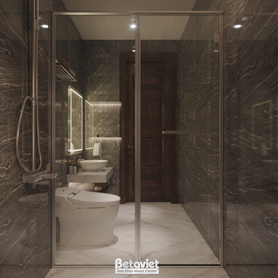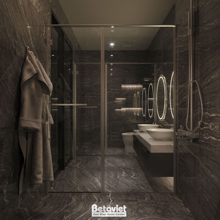 Điểm nhấn nổi bật trong toàn bộ hệ thống phòng tắm là việc sử dụng đá tự nhiên cao cấp ốp sàn và tường, với các tone màu chủ đạo như vân mây trắng, xám tro, hoặc vân đá đen ánh kim, tạo nên vẻ đẹp sạch sẽ, thanh thoát mà vẫn đầy chiều sâu. Bề mặt đá được xử lý chống trơn trượt, đảm bảo an toàn tuyệt đối cho người sử dụng ở mọi độ tuổi.