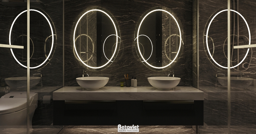 Liền kề phòng ngủ là phòng tắm Master khép kín, được thiết kế như một spa thu nhỏ. Vật liệu đá vân tự nhiên cao cấp ốp tường và sàn tạo nên vẻ đẹp sang trọng, sạch sẽ và dễ bảo trì. Hệ lavabo đôi giúp hai người có thể sử dụng cùng lúc một cách tiện lợi, trong khi gương tròn viền LED mang đến ánh sáng dịu nhẹ, tôn lên vẻ hiện đại và tinh tế. Khu vực tắm kính riêng biệt đảm bảo phân chia khô – ướt rõ ràng, giữ cho không gian luôn gọn gàng và thoáng đãng.