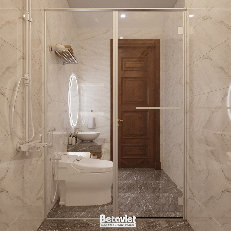 Thiết bị vệ sinh thông minh được lựa chọn kỹ lưỡng từ các thương hiệu cao cấp – bồn cầu cảm ứng, vòi sen âm tường tích hợp nhiệt độ, và hệ thống xả tự động – mang lại trải nghiệm tiện nghi bậc nhất cho người dùng. Đặc biệt, lavabo đặt bàn kết hợp với gương LED tròn viền ánh sáng hắt nhẹ không chỉ là yếu tố công năng mà còn là điểm nhấn thẩm mỹ tinh tế trong không gian.