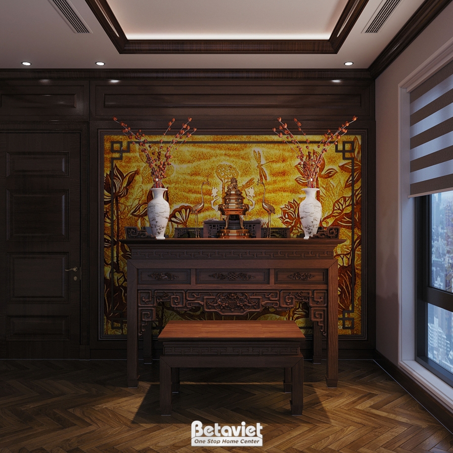 Phía sau bàn thờ là mảng tường ốp gỗ kết hợp tranh sen vàng giả cổ – biểu tượng của sự thanh tịnh và thuần khiết trong Phật giáo, giúp nâng tầm giá trị thẩm mỹ và tinh thần của không gian. Thiết kế này không chỉ mang tính nghệ thuật mà còn góp phần tạo điểm nhấn trung tâm cho toàn bộ phòng thờ, hướng mọi ánh nhìn về nơi linh thiêng nhất.