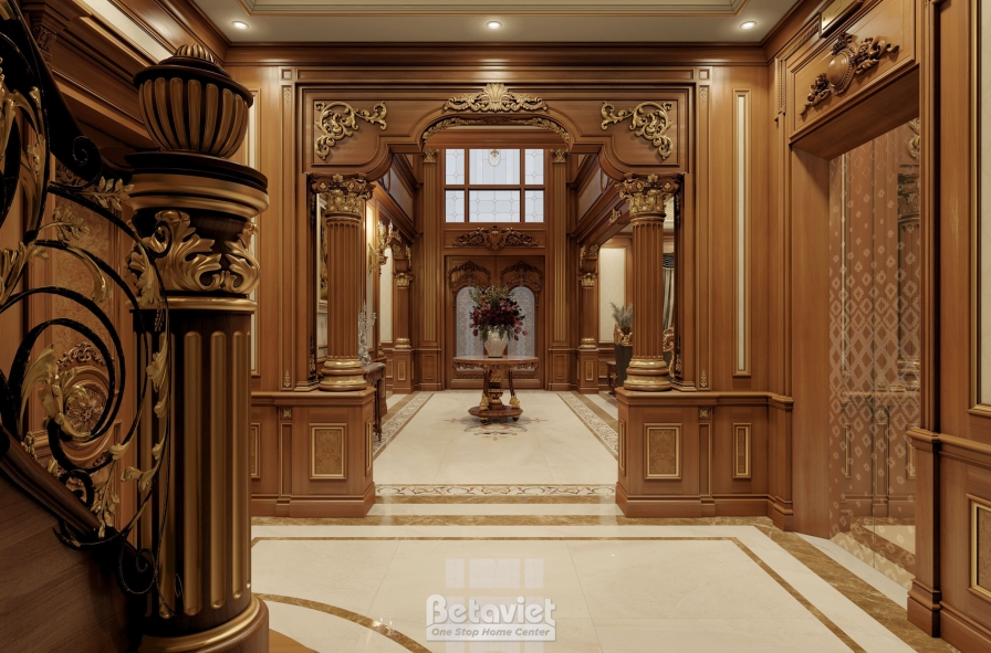 Ấn tượng đầu tiên khi bước vào hành lang chính là hệ tường ốp gỗ tự nhiên cao cấp với gam màu nâu trầm ấm, mang lại cảm giác vững chãi và đầy chiều sâu. Các mảng tường được phân chia theo tỷ lệ chuẩn mực, kết hợp cùng phào chỉ và họa tiết trang trí tinh tế, tạo nên sự cân đối hài hòa về thị giác. Không gian vì thế không hề đơn điệu mà ngược lại, mang đậm dấu ấn nghệ thuật, thể hiện rõ phong cách sống thượng lưu của gia chủ.