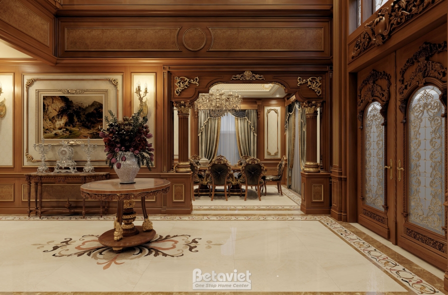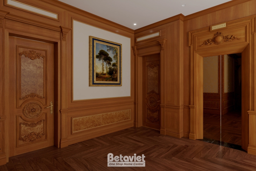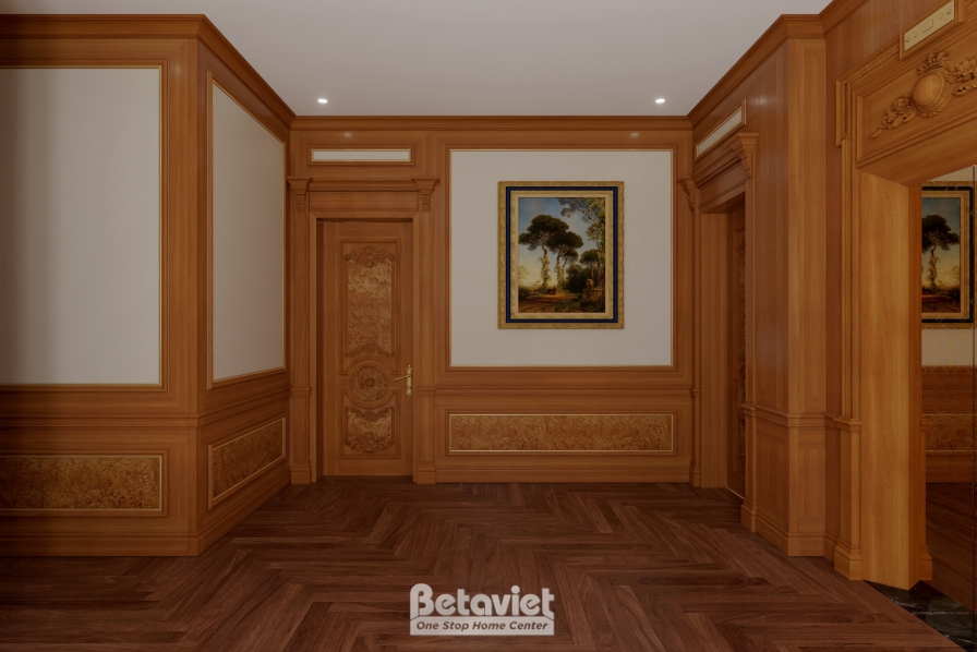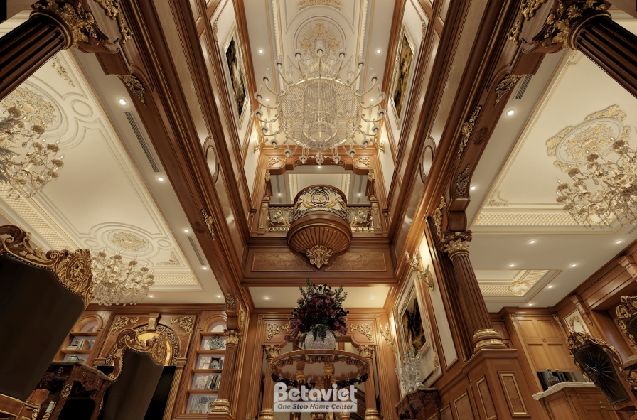 Toàn bộ hệ tường được ốp gỗ tự nhiên cao cấp với tông nâu trầm ấm, kết hợp cùng các chi tiết hoa văn dát vàng và phào chỉ tinh xảo. Cách xử lý đối xứng trong bố cục không chỉ tạo nên sự cân bằng thị giác mà còn làm nổi bật chiều sâu không gian – một đặc trưng quan trọng trong thiết kế nội thất cổ điển.