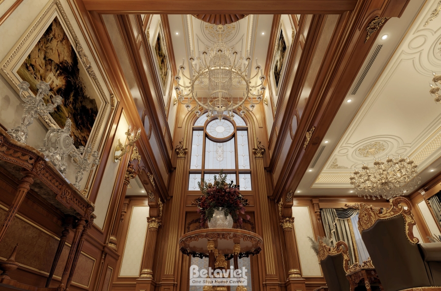 Đại sảnh là nơi tạo ấn tượng đầu tiên khi bước vào biệt thự, và trong dự án này, không gian được đầu tư như một tác phẩm nghệ thuật thực thụ.
