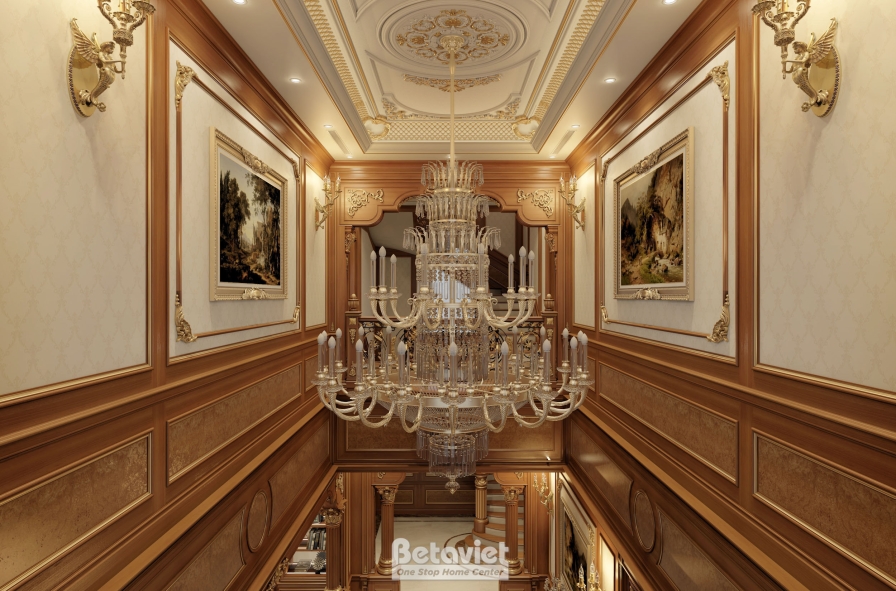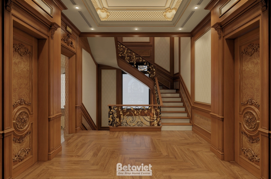 Phần trần được thiết kế giật cấp với các chi tiết trang trí nhẹ nhàng, kết hợp hệ đèn âm trần phân bổ đều, mang đến nguồn ánh sáng vàng ấm áp. Ánh sáng không chỉ đóng vai trò chiếu sáng mà còn giúp làm nổi bật bề mặt vật liệu, tôn lên vẻ đẹp của gỗ và các đường nét kiến trúc. Nhờ cách xử lý ánh sáng tinh tế, hành lang trở nên mềm mại, sang trọng mà không tạo cảm giác nặng nề – một yếu tố rất quan trọng trong các công trình biệt thự phong cách cổ điển.